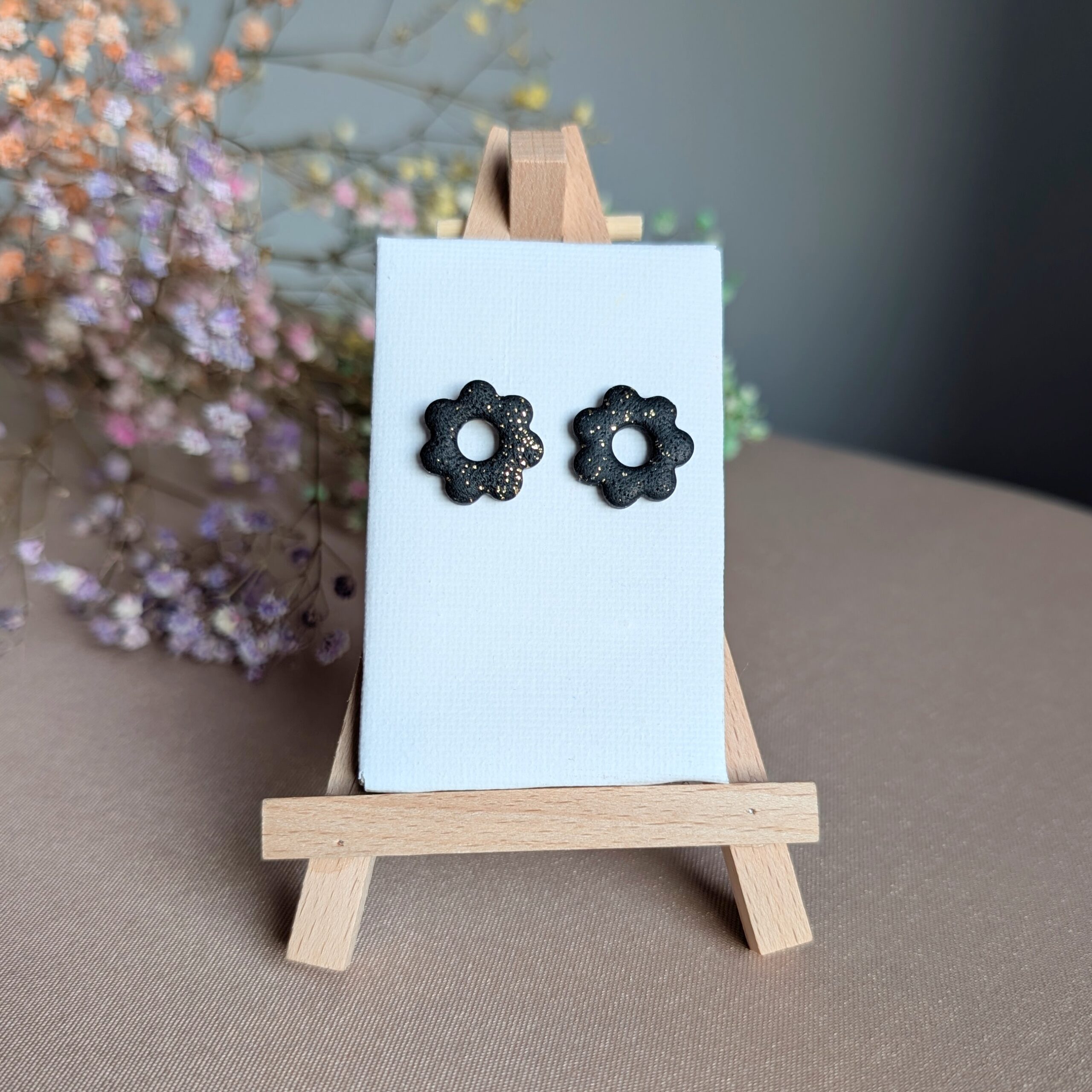 Czarne kolczyki-stokrotki handmade z gliny polimerowej to drobny akcent, który dodaje uroku i podkreśla Twój styl.