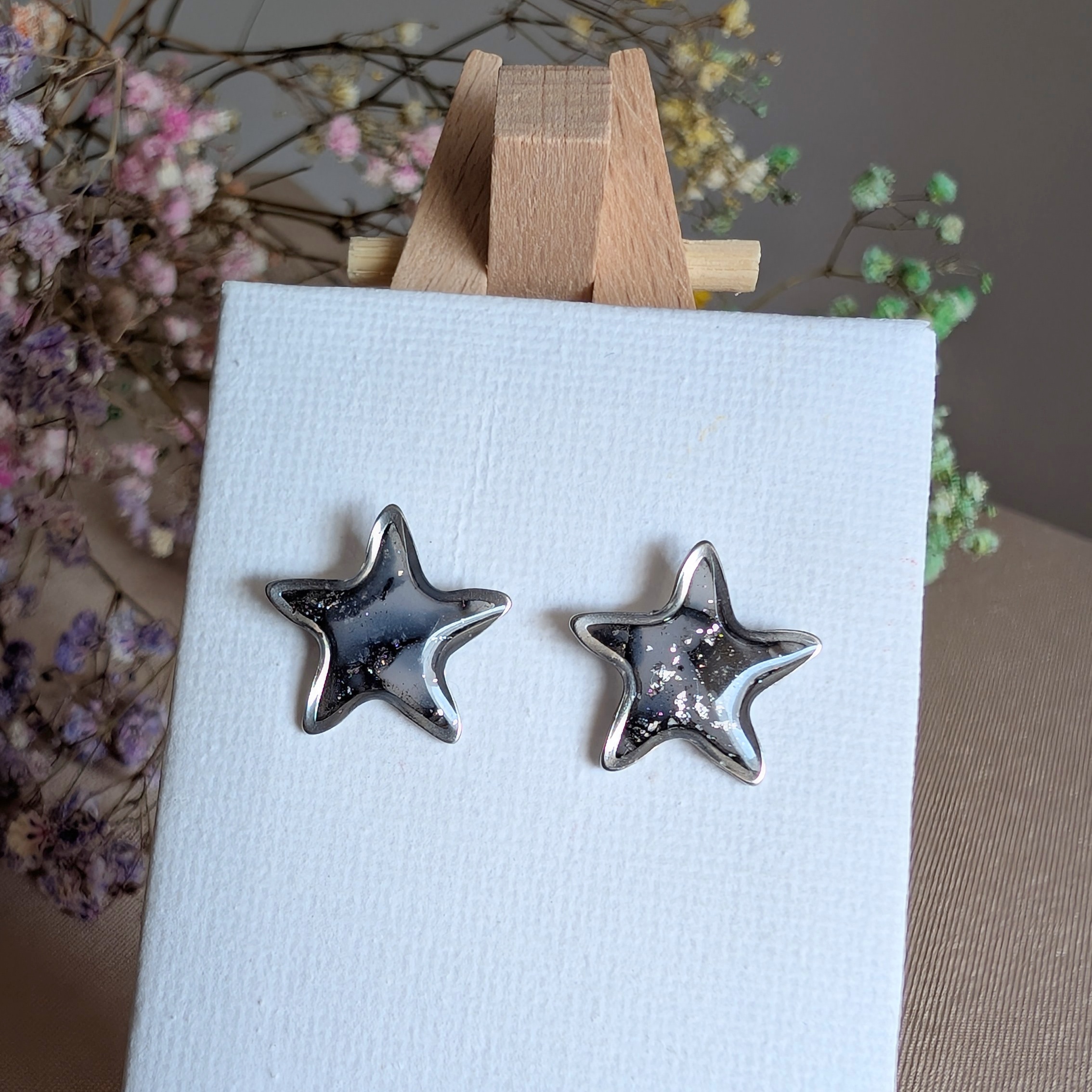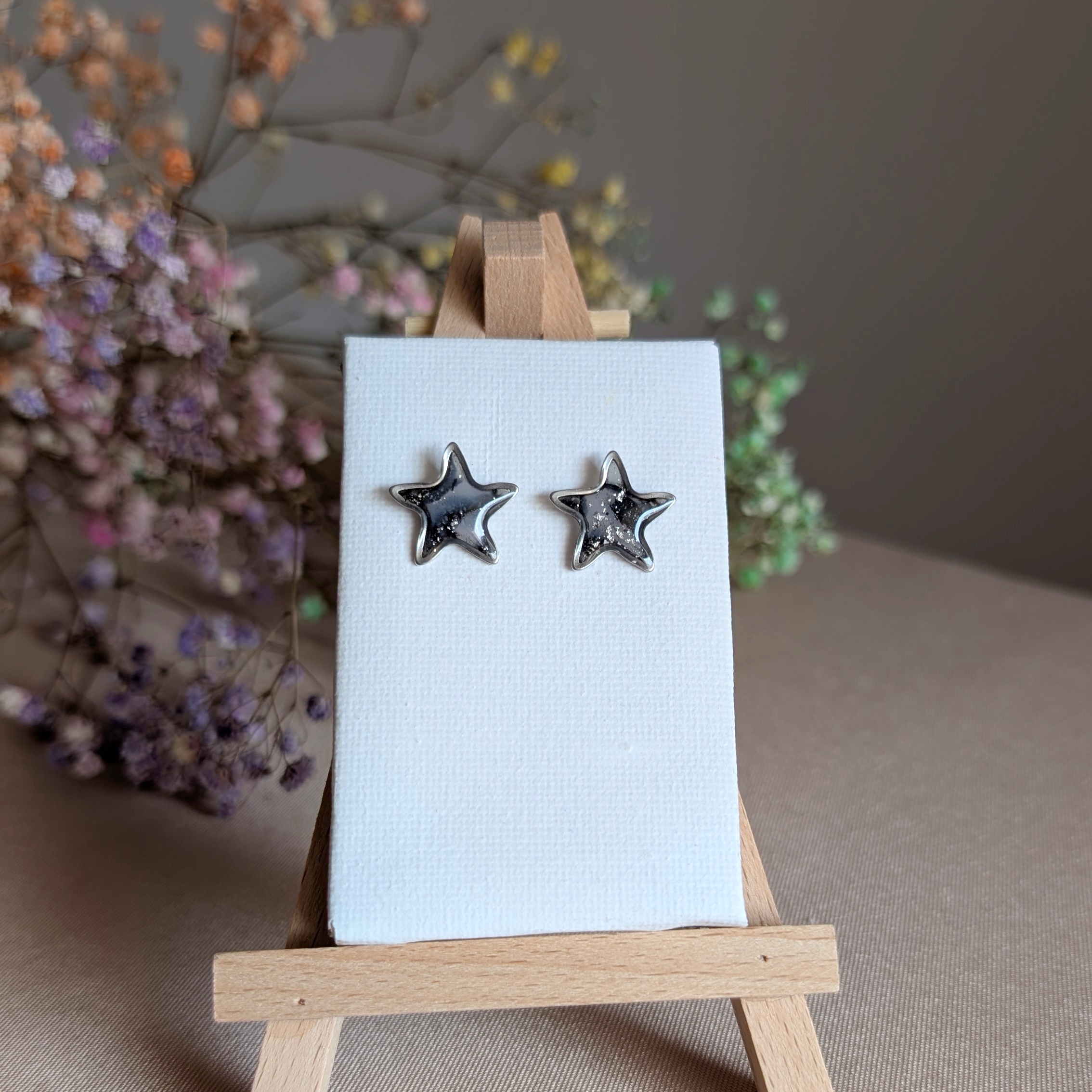 Szukasz dodatku, który podkreśli Twój styl i doda elegancji każdej stylizacji? Te czarne marmurkowe kolczyki handmade wykonane z gliny polimerowej i zalane warstwą przezroczystej żywicy to połączenie nowoczesnego designu i rękodzielniczej precyzji. Ozdobione subtelną srebrną folią, przypominają rozgwieżdżone niebo zamknięte w formie gwiazdki.