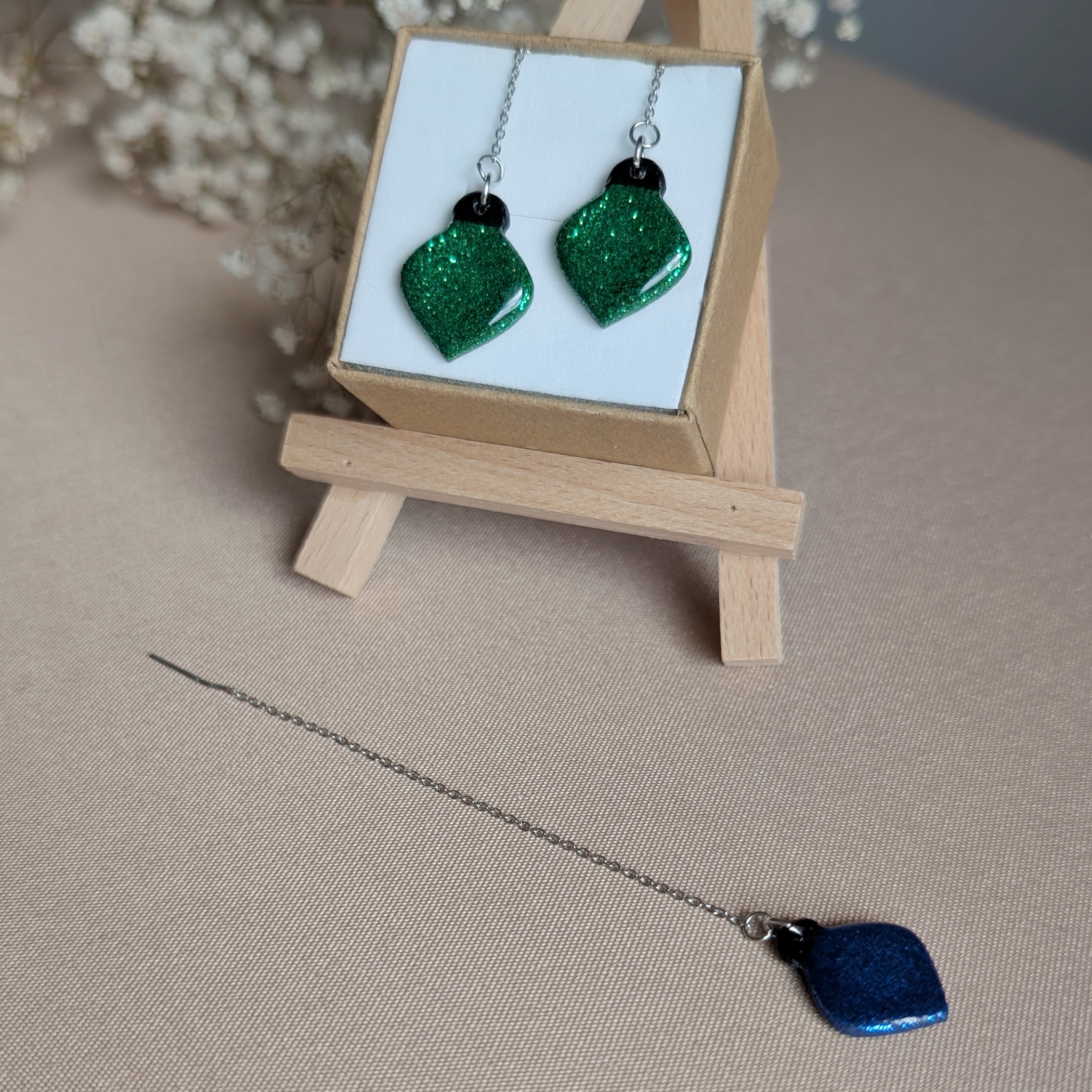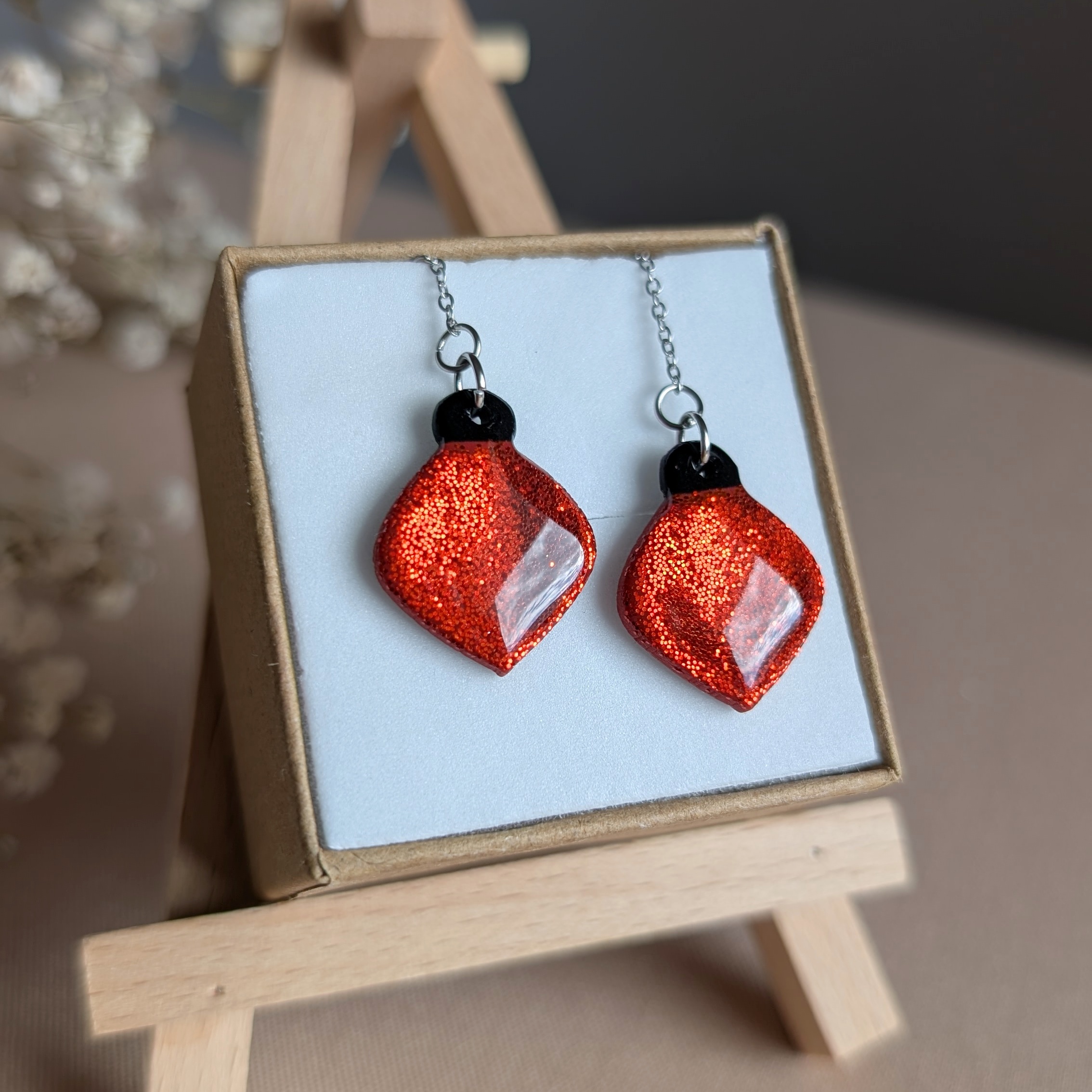 Te kolczyki w kształcie bombek choinkowych to pełne blasku dopełnienie świątecznych stylizacji. Ręcznie wykonane z gliny polimerowej, pokryte warstwą brokatu i wykończone na połysk z pomocą żywicy, odbijają światło niczym prawdziwe ozdoby z choinki. Delikatnie zwisające na srebrnym łańcuszku, poruszają się lekko przy każdym ruchu, dodając uroku i elegancji.