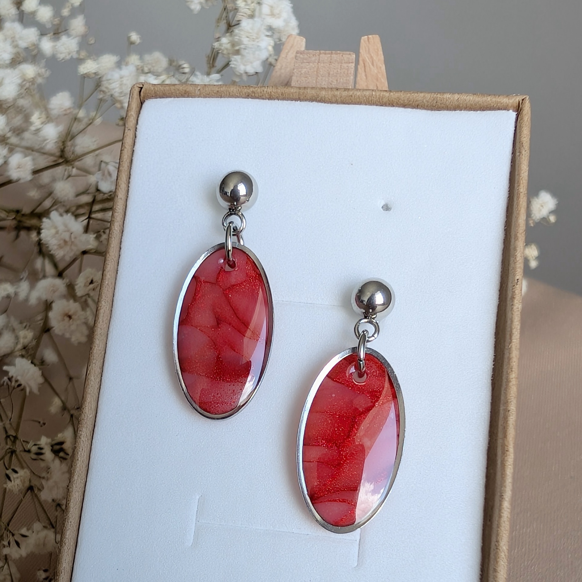 Dodaj odrobinę ognistej energii do swojej stylizacji dzięki tym wyjątkowym kolczykom w owalnym kształcie. Ręcznie wykonane z gliny polimerowej, zachwycają głębokim odcieniem czerwieni z delikatnym połyskiem zamkniętym w metalowej oprawie. Idealne połączenie klasyki i nowoczesności.