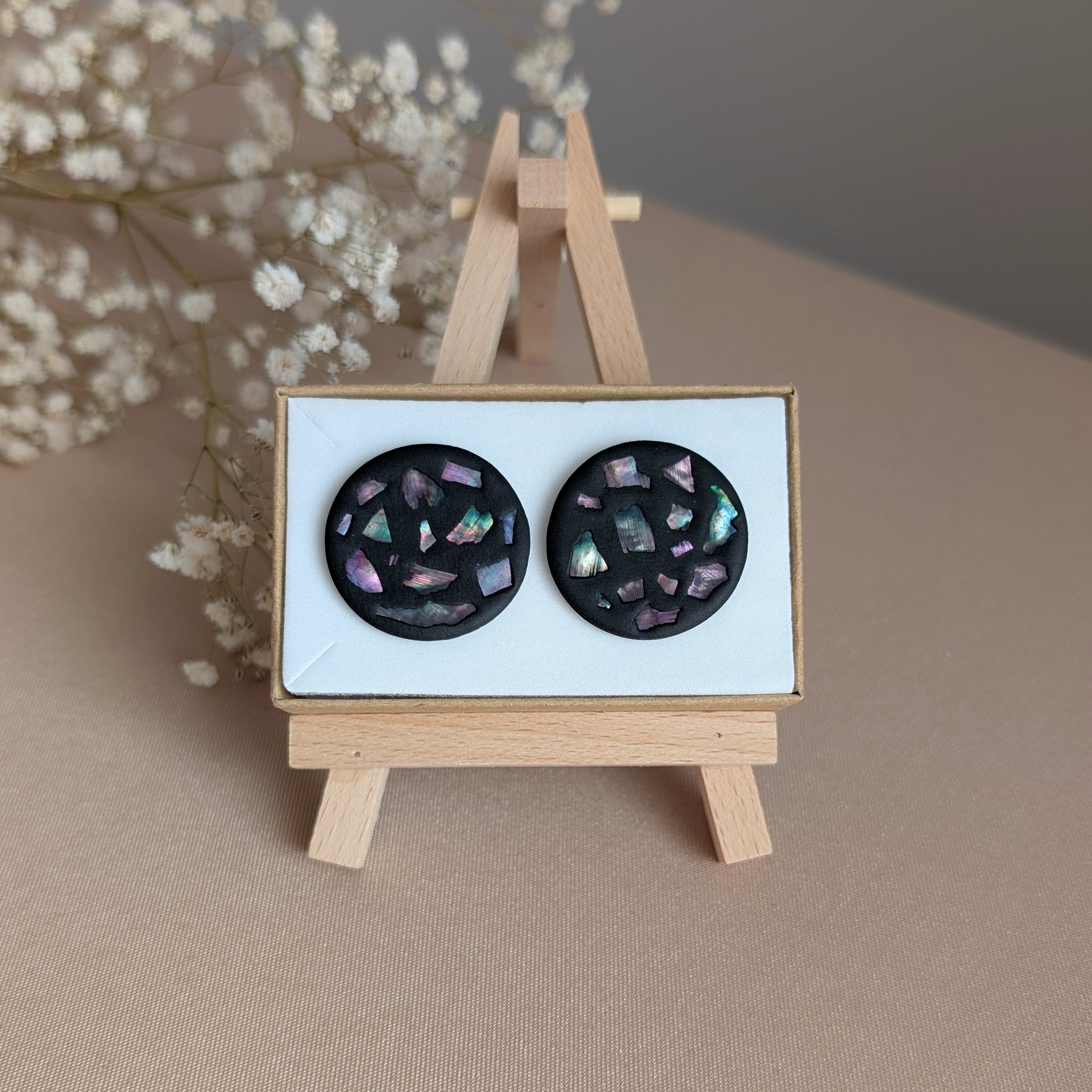 Te wyjątkowe kolczyki z gliny polimerowej zachwycają subtelnym połyskiem i naturalnym urokiem. W ich czarnej bazie zatopione zostały drobinki muszelek, które delikatnie odbijają światło, tworząc efekt perłowego blasku. Organiczny kształt nadaje im nowoczesnego charakteru i sprawia, że każdy egzemplarz jest jedyny w swoim rodzaju.