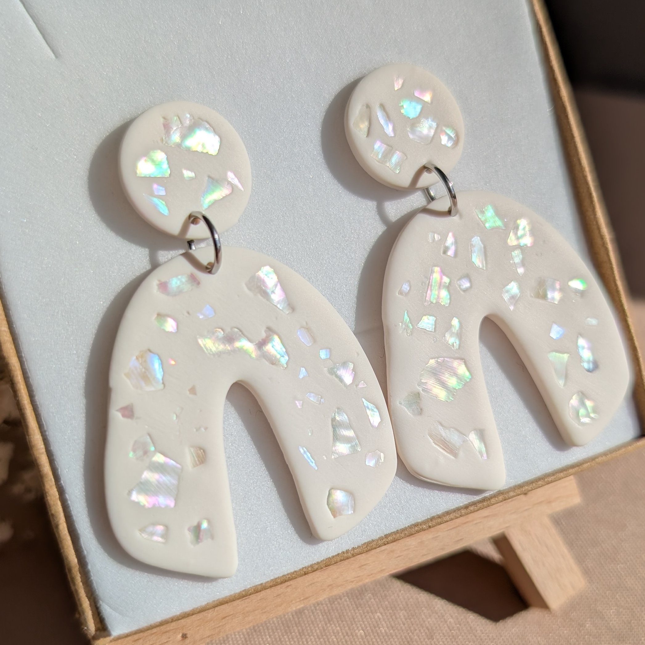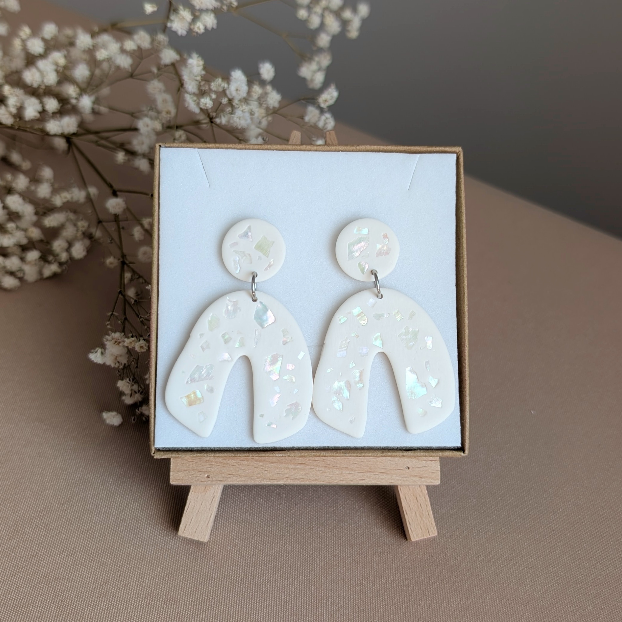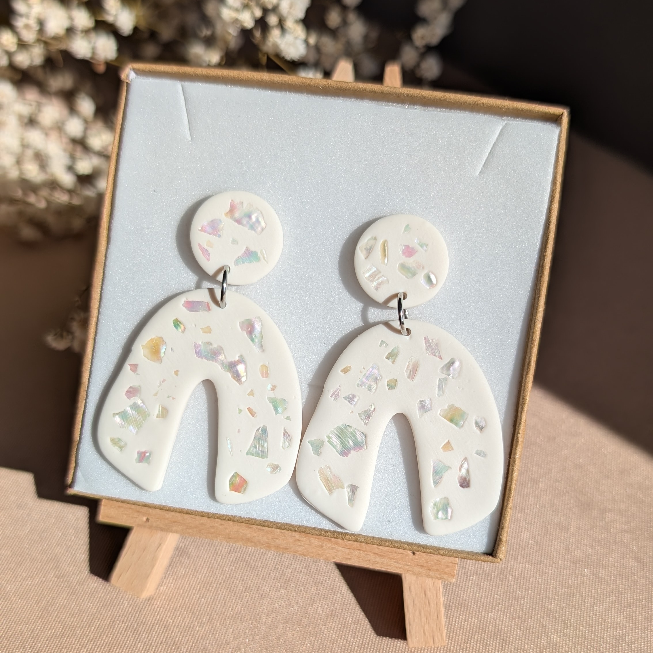 Te wyjątkowe kolczyki z gliny polimerowej zachwycają subtelnym połyskiem i naturalnym urokiem. W ich kremowej bazie zatopione zostały drobinki muszelek, które delikatnie odbijają światło, tworząc efekt perłowego blasku. Organiczny kształt nadaje im nowoczesnego charakteru i sprawia, że każdy egzemplarz jest jedyny w swoim rodzaju.