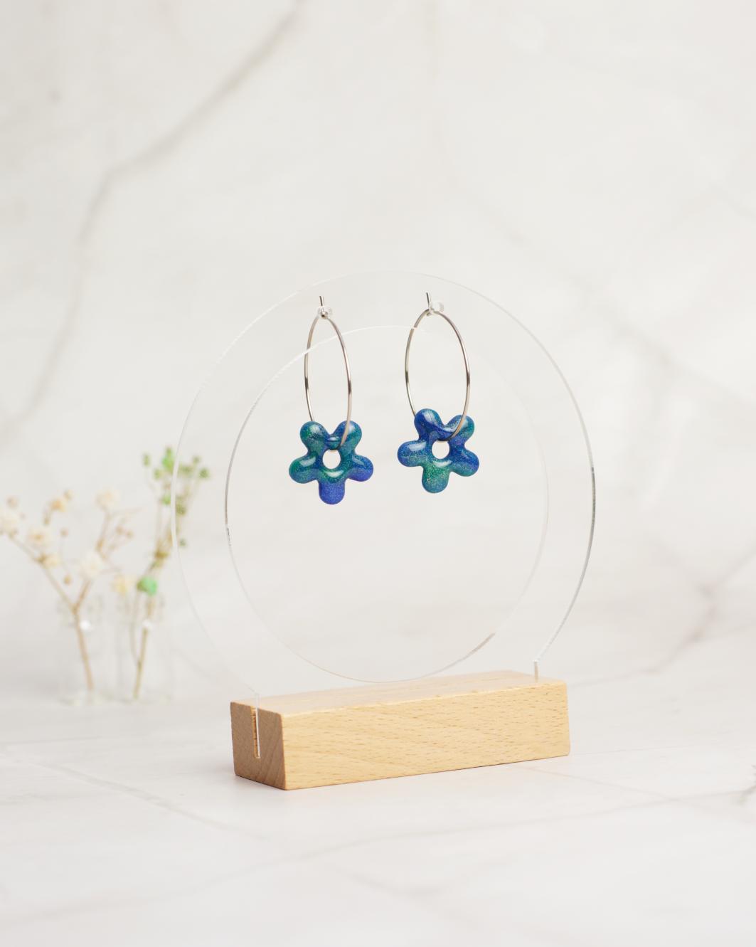 Ich największą zaletą jest dwustronna forma – z jednej strony zachwycają delikatnym, artystycznym wzorem, a po odwróceniu odkrywają błyszczącą powierzchnię z mieniącymi się drobinkami, która pięknie odbija światło i dodaje elegancji. Dodatkowo elementy w kształcie kwiatków możesz dowolnie przekładać i zestawiać, tworząc własne kompozycje. Dzięki temu jedne kolczyki dają Ci wiele możliwości stylizacji – od subtelnych po bardziej wyraziste.