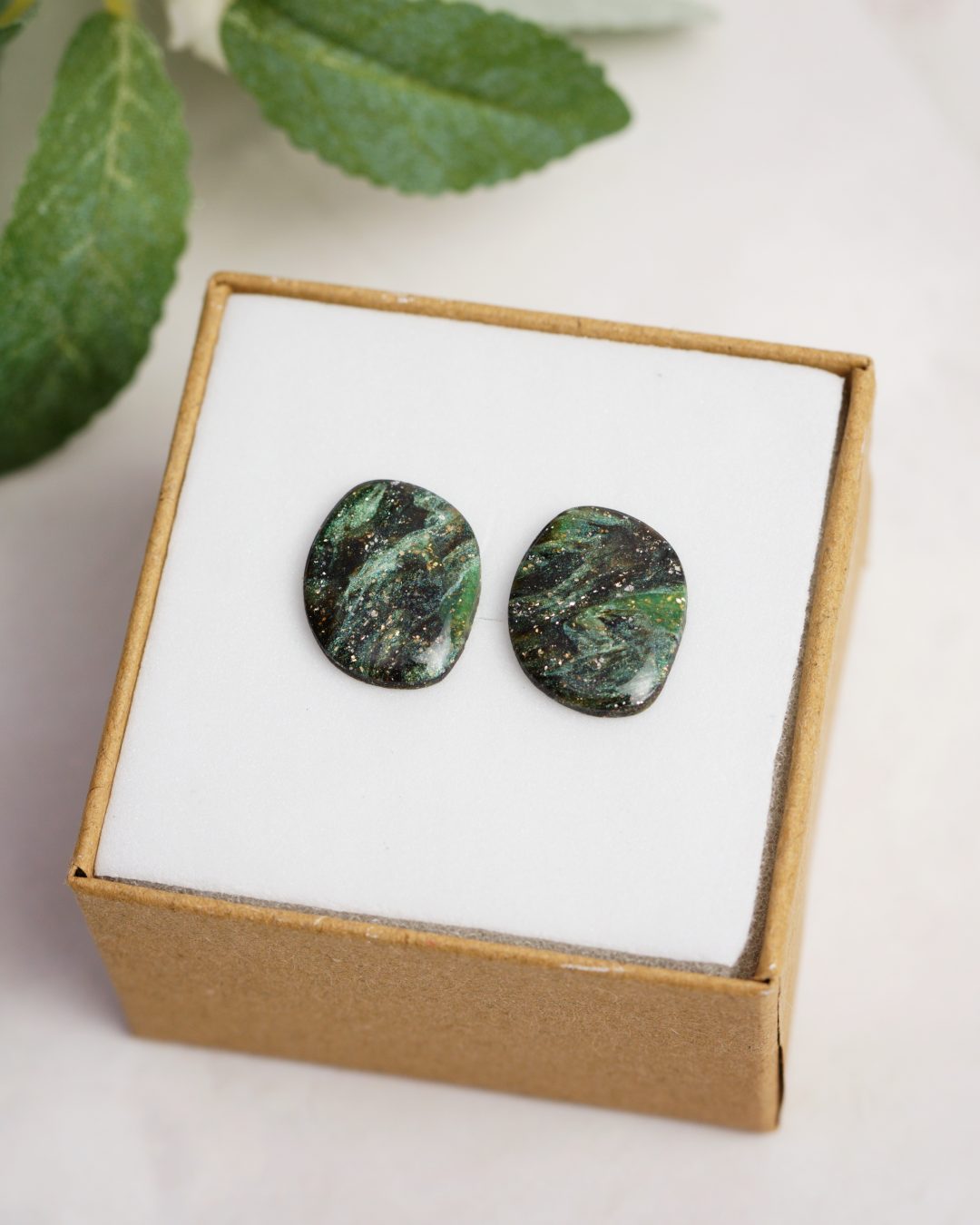 Wyjątkowe ręcznie robione kolczyki z gliny polimerowej, których wzór przypomina głębię kosmicznej mgławicy lub tajemniczy kamień szlachetny. Intensywny brąz przeplata się z odcieniami szmaragdowej zieleni i delikatnym złotym połyskiem, tworząc elegancki, artystyczny efekt. Ich organiczny, nieregularny kształt przyciąga uwagę i dodaje stylizacji subtelnej elegancji. Dzięki temu kolczyki są jednocześnie minimalistyczne i wyraziste – idealne dla kobiet, które cenią unikalną biżuterię handmade.