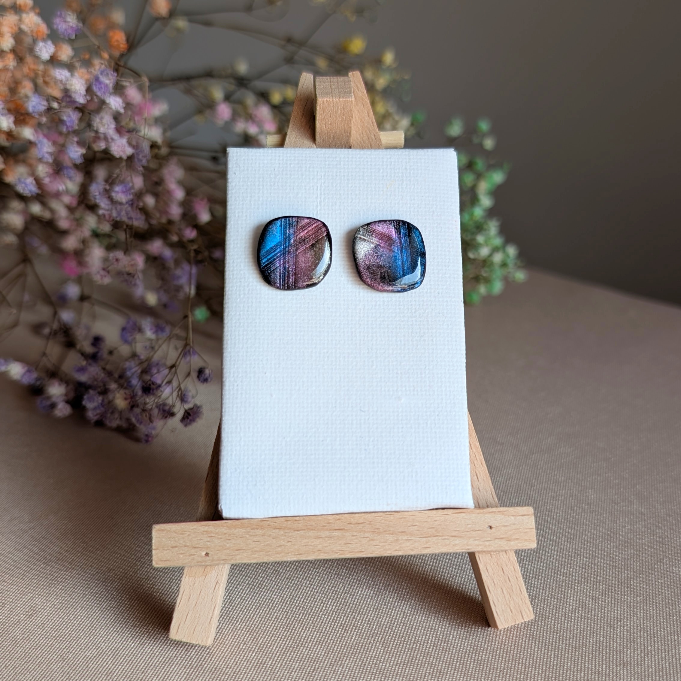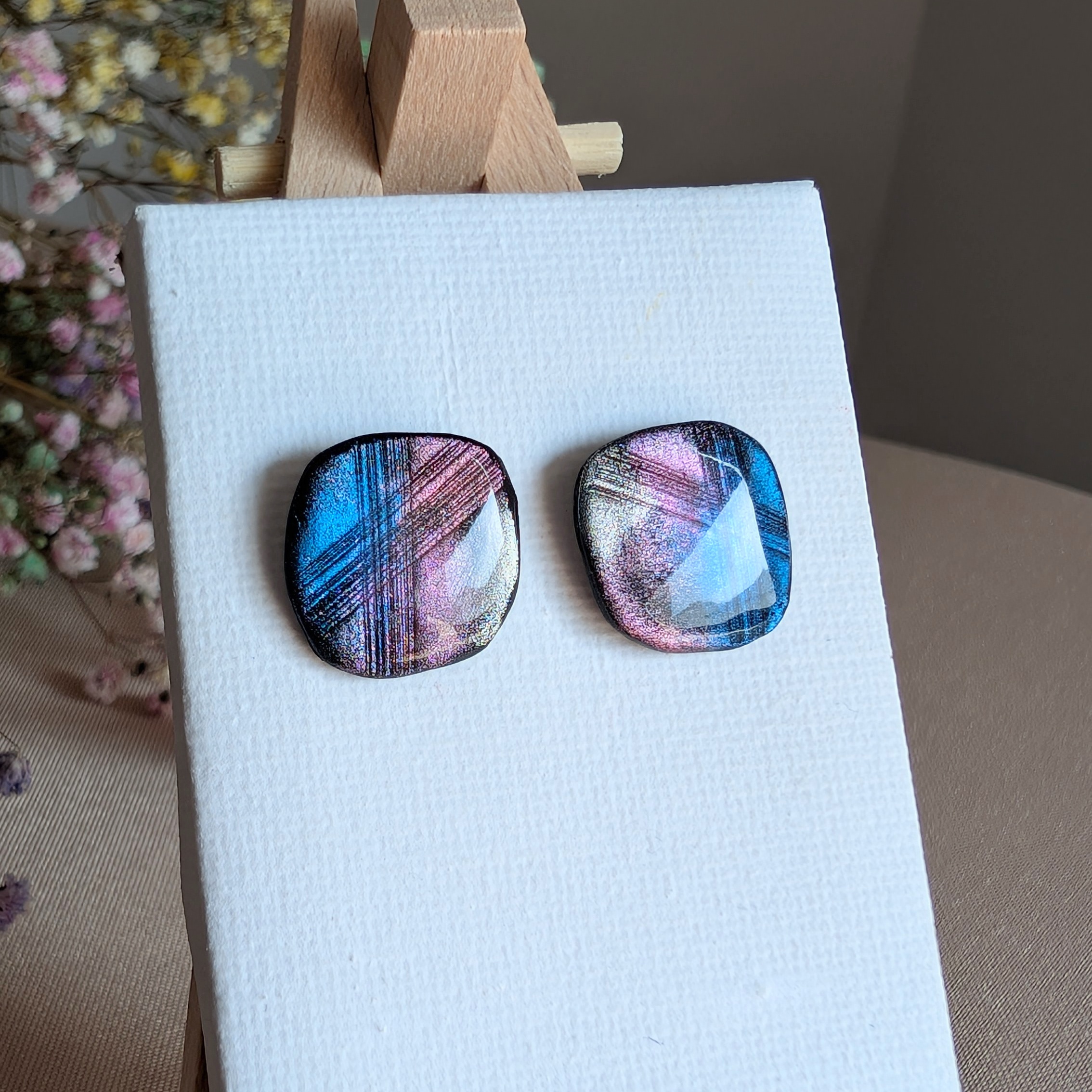 Wyjątkowe kolczyki o geometrycznym, modnym kształcie, wykonane ręcznie z gliny polimerowej. Powierzchnia mieni się niebieskimi, różowymi i srebrnymi refleksami, które w świetle tworzą efekt prawdziwego, metalicznego blasku i przypominają prawdziwy galaktyczny obraz. To biżuteria, która przyciąga uwagę i dodaje charakteru każdej stylizacji.
