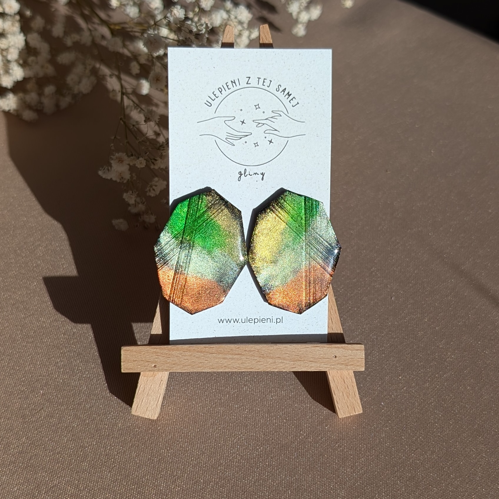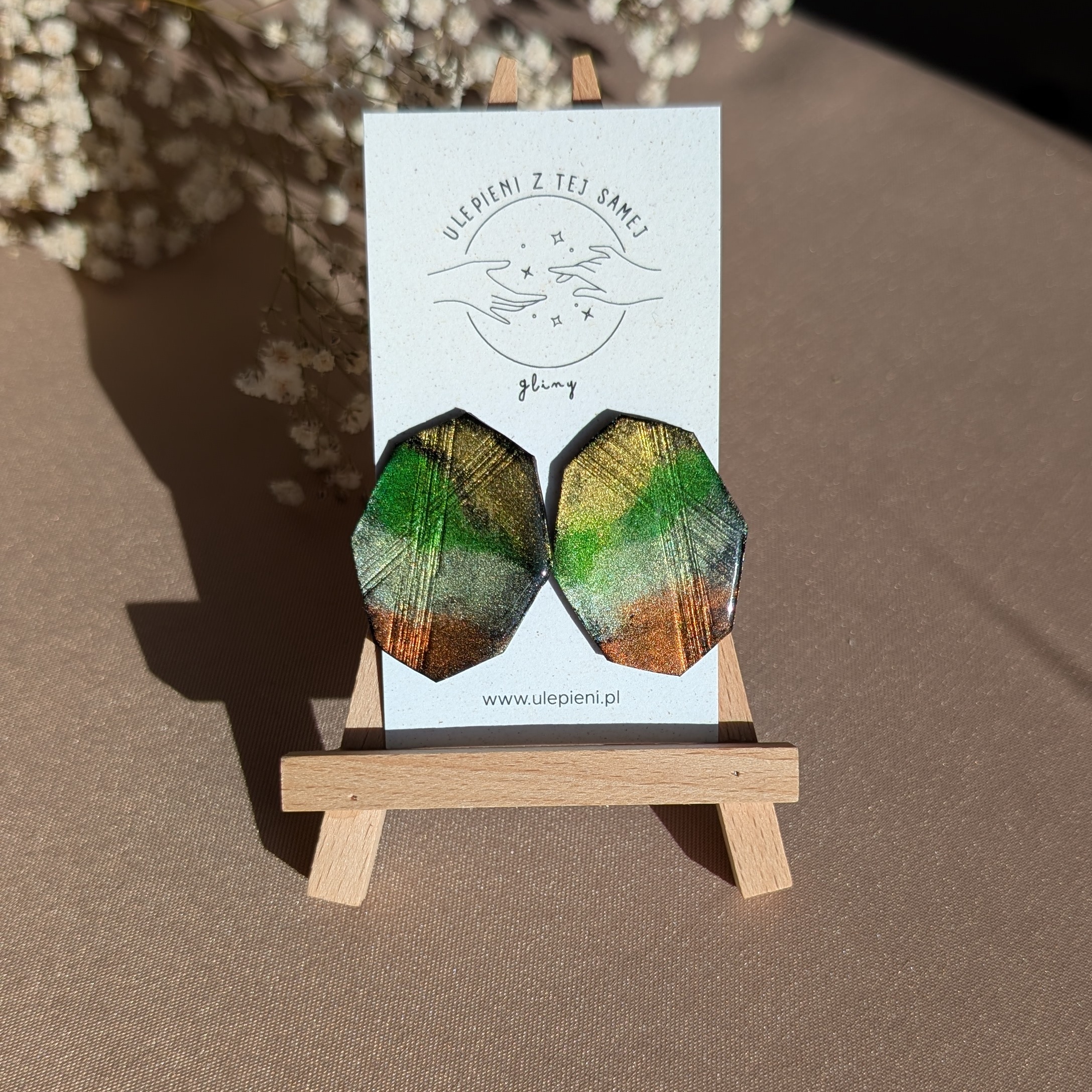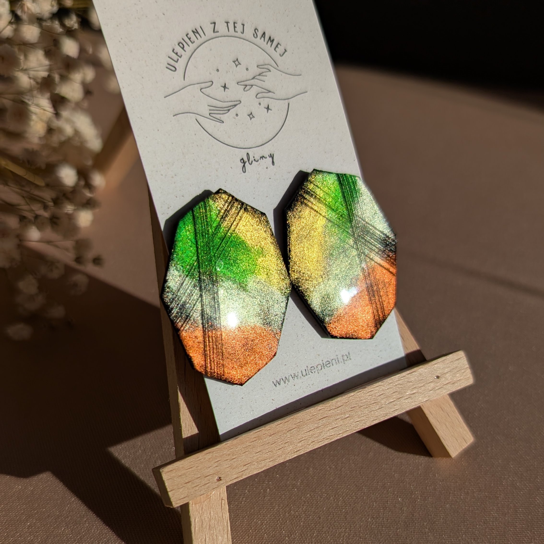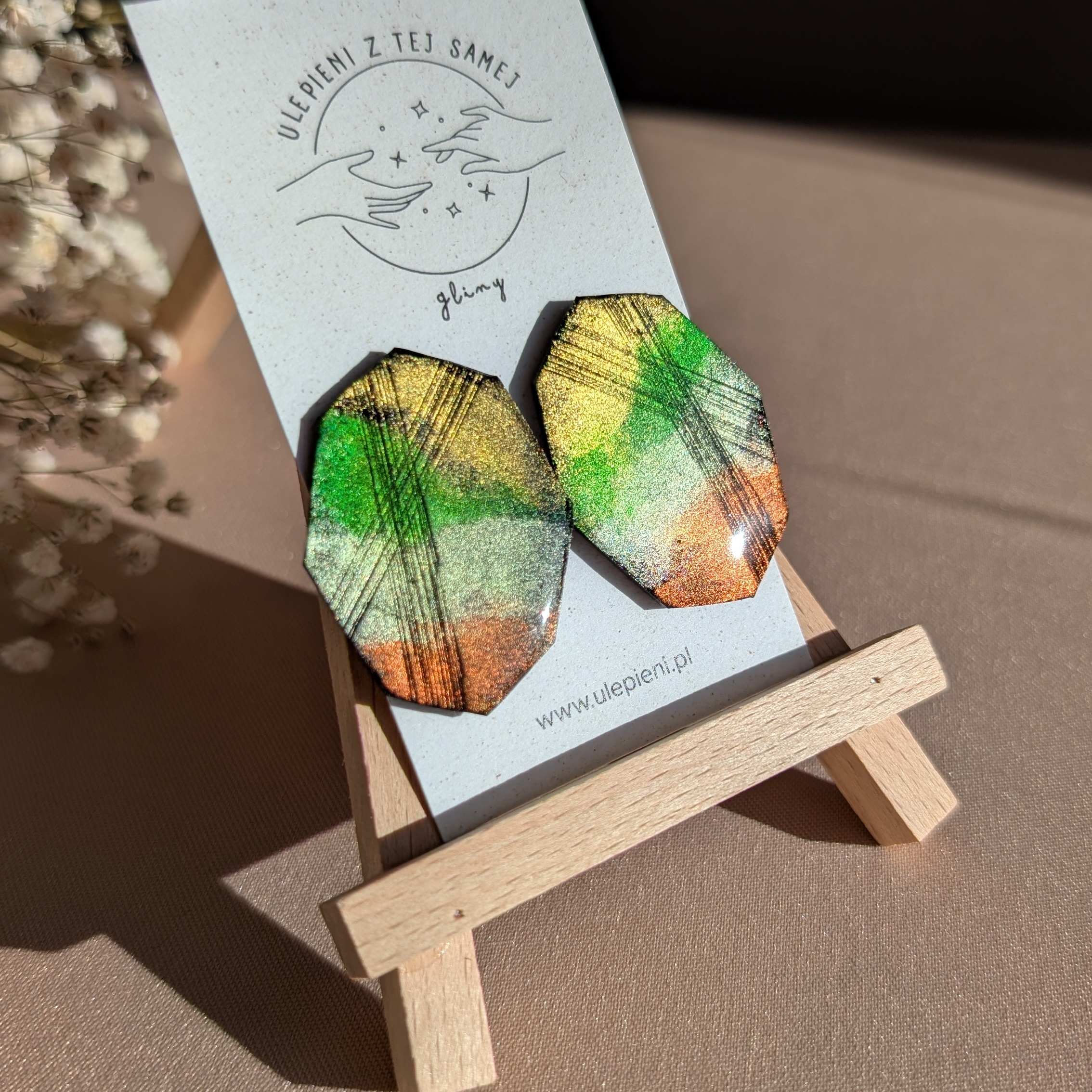 Wyjątkowe kolczyki o geometrycznym, modnym kształcie, wykonane ręcznie z gliny polimerowej. Powierzchnia mieni się zielonymi, złotymi i miedzianymi refleksami, które w świetle tworzą efekt prawdziwego, metalicznego blasku. To biżuteria, która przyciąga uwagę i dodaje charakteru każdej stylizacji.