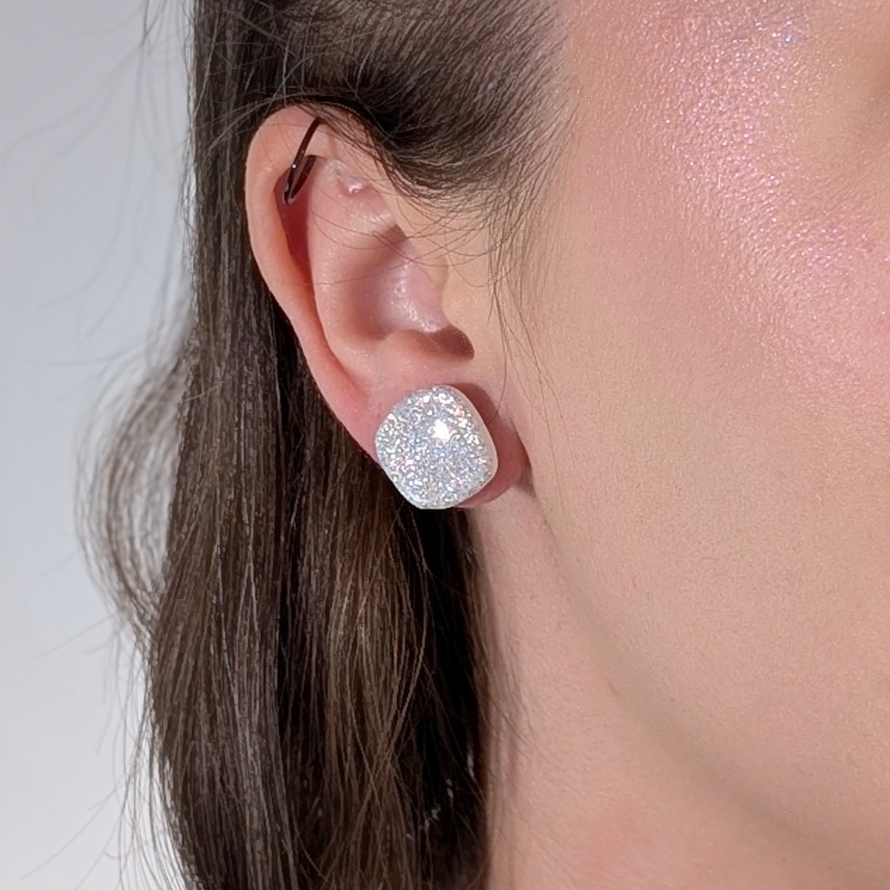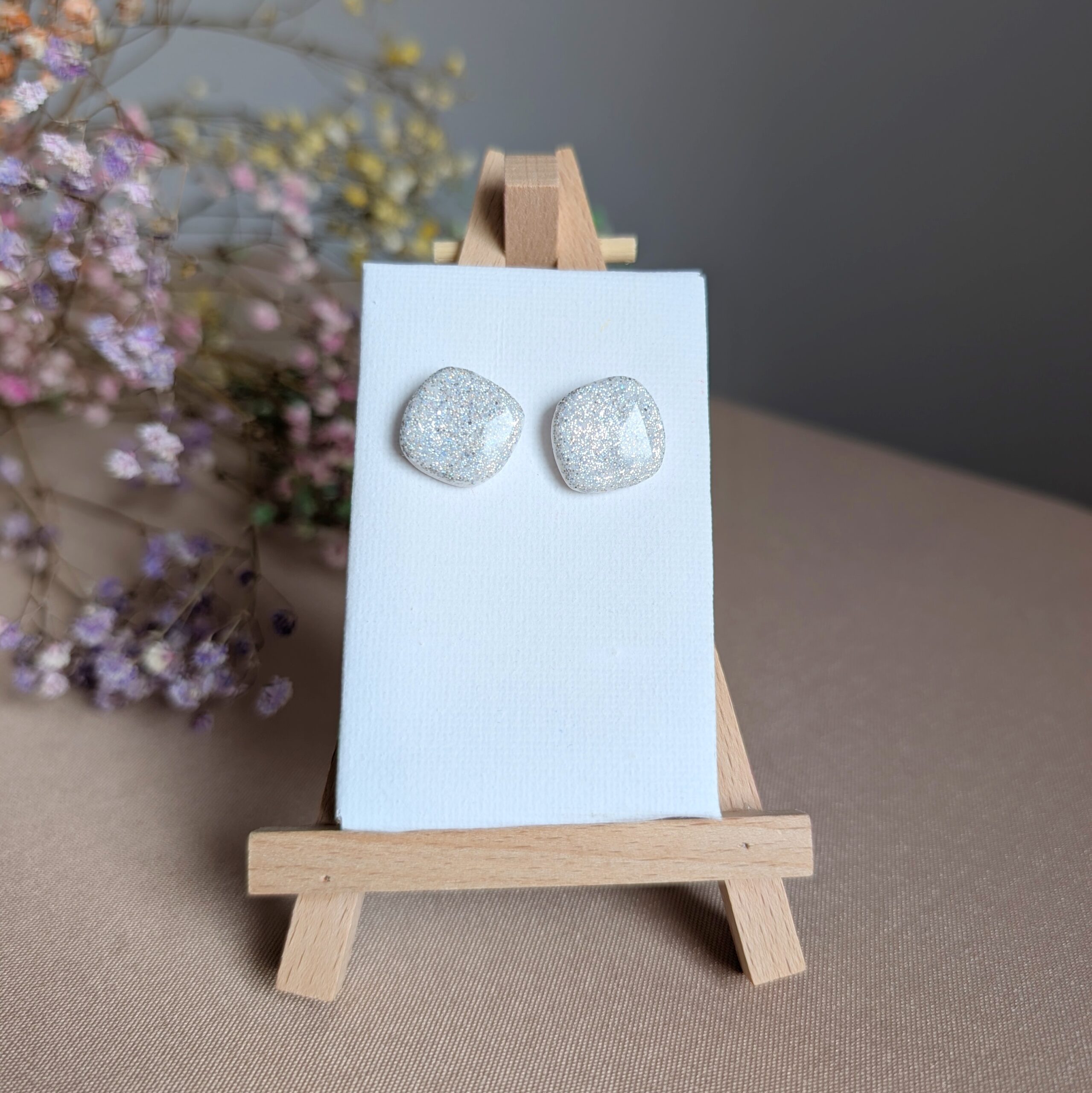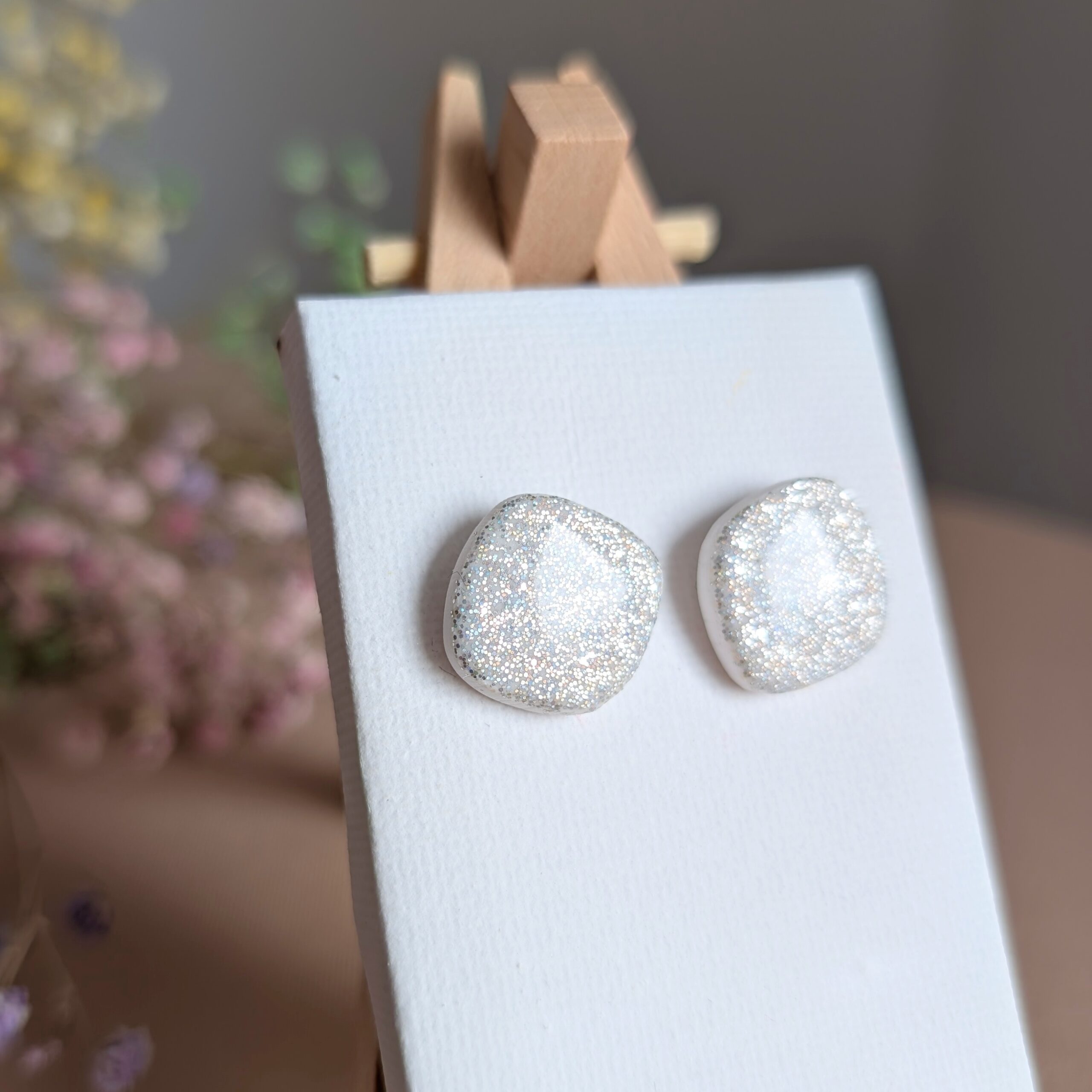 Olśniewające i nowoczesne – kolczyki o geometrycznym, miękkim kształcie wykonane z gliny polimerowej to idealna propozycja dla osób, które kochają wyjątkową biżuterię handmade. Ich powierzchnia została wykończona holograficznym brokatem, który pięknie mieni się w świetle, nadając stylizacji elegancji i blasku.