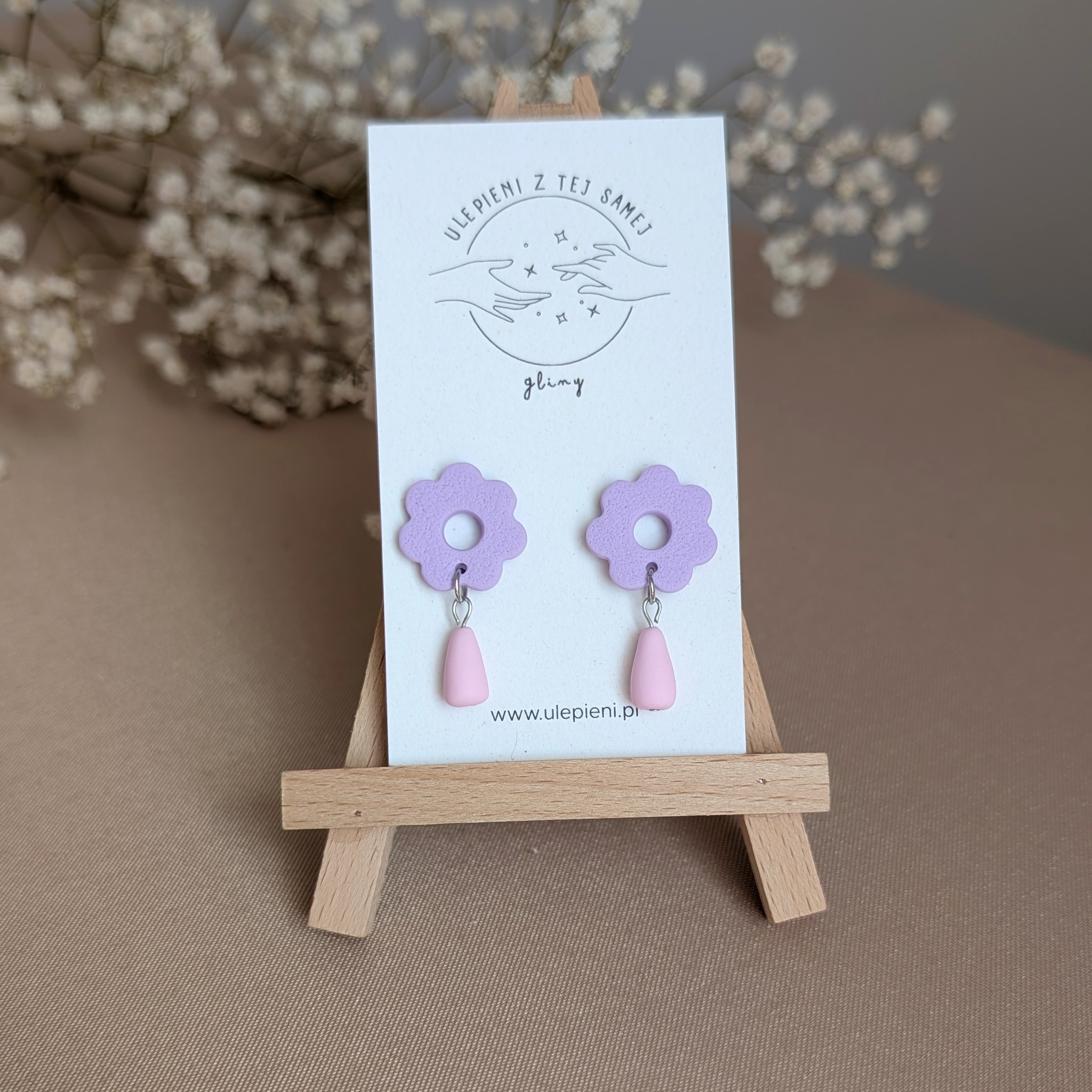 Wprowadź do swojej stylizacji odrobinę słodyczy i lekkości dzięki tym uroczym kolczykom. Ręcznie wykonane z gliny polimerowej, łączą w sobie fioletowy kwiat i różowy, delikatnie zwisający element w kształcie łezki. Idealne dla fanek pastelowych dodatków, stylu kawaii i niebanalnej biżuterii handmade.