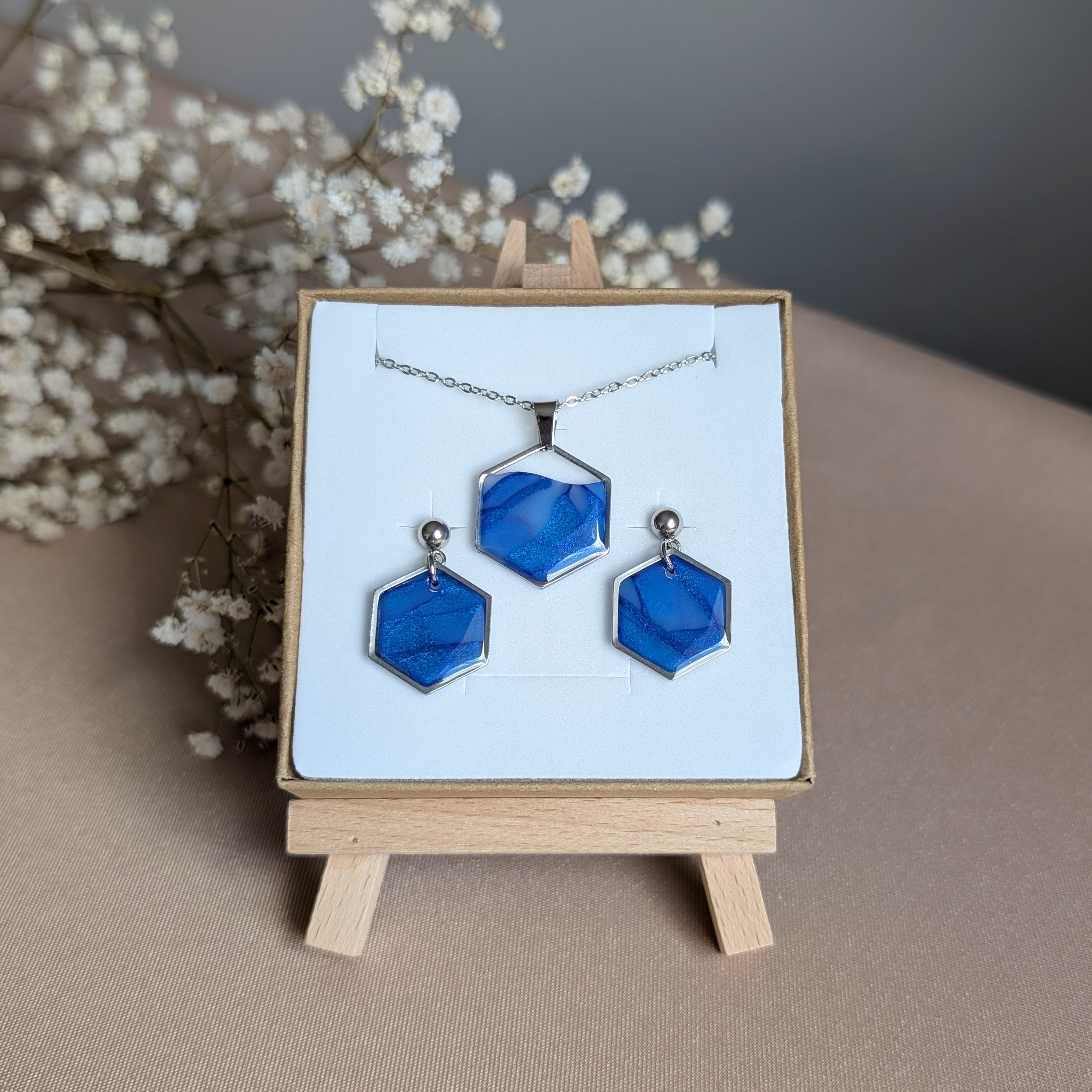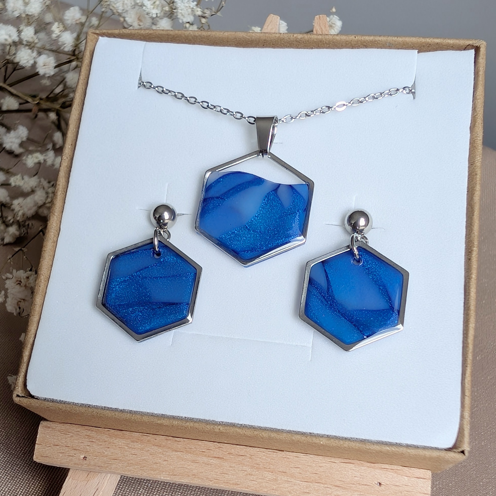 Podkreśl swój styl wyjątkowym zestawem biżuterii handmade wykonanym z wysokiej jakości gliny polimerowej. Ten elegancki komplet składa się z pary kolczyków oraz naszyjnika z zawieszką, utrzymanych w modnych odcieniach niebieskiego i srebra.