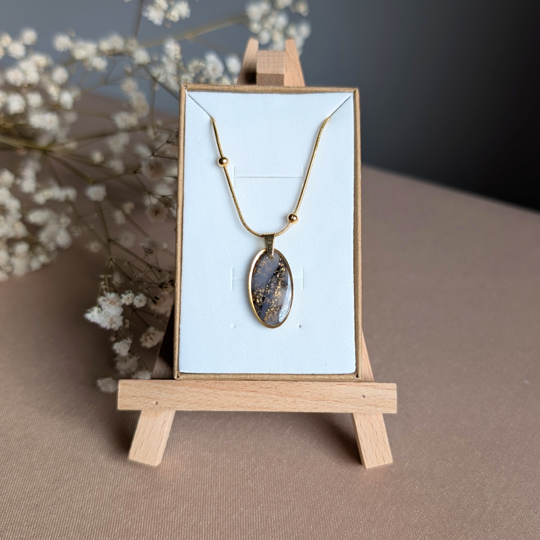 Ręcznie wykonana zawieszka z gliny polimerowej w kształcie owalu, zamknięta w złotej oprawie. Jej powierzchnia imituje naturalny kamień z subtelnymi żyłkami w ciemnych odcieniach, przeplecionymi delikatnym złotym połyskiem, który pięknie odbija światło. Każdy egzemplarz jest unikatowy – różni się układem wzoru i intensywnością barw, dzięki czemu masz pewność, że nosisz jedyny w swoim rodzaju egzemplarz biżuterii.