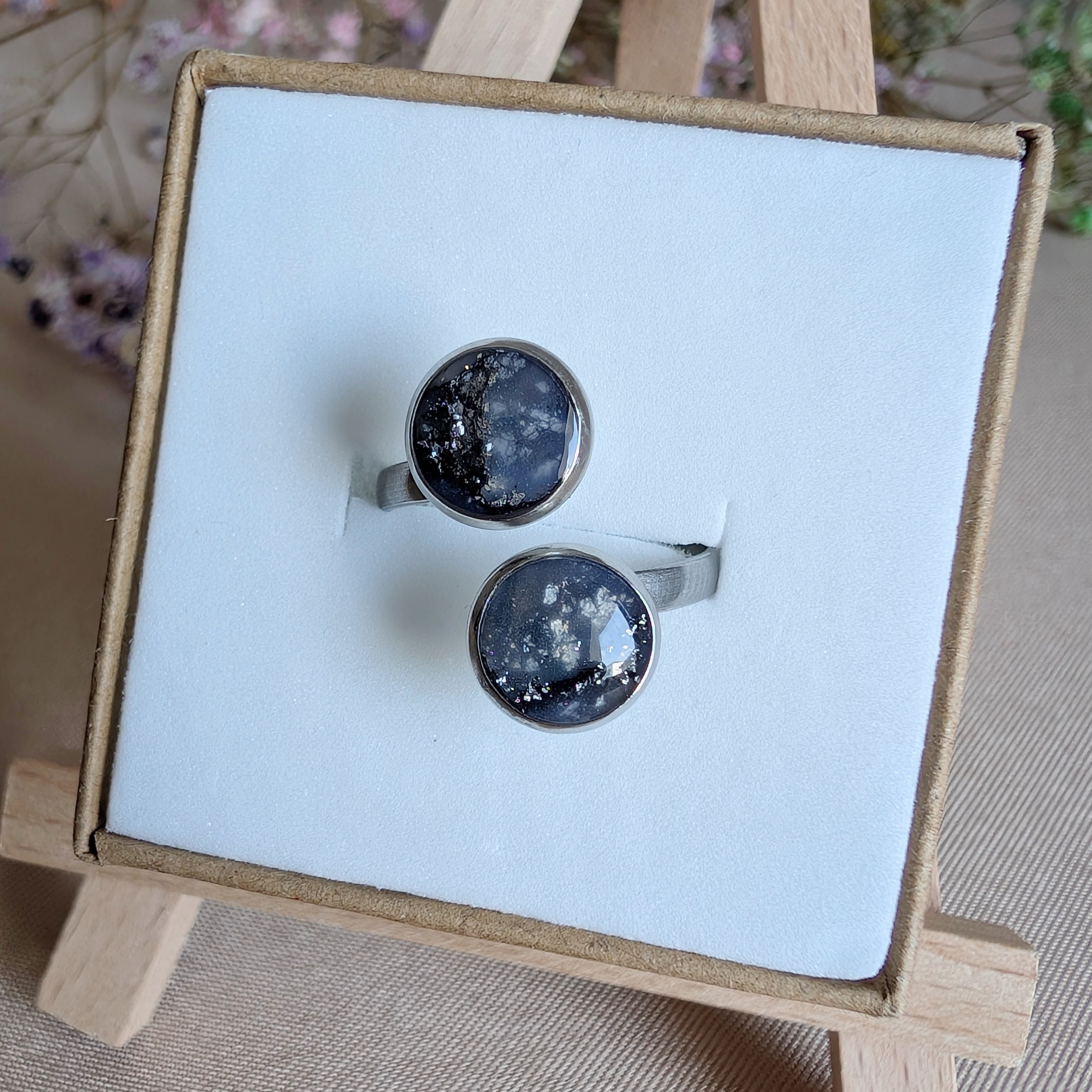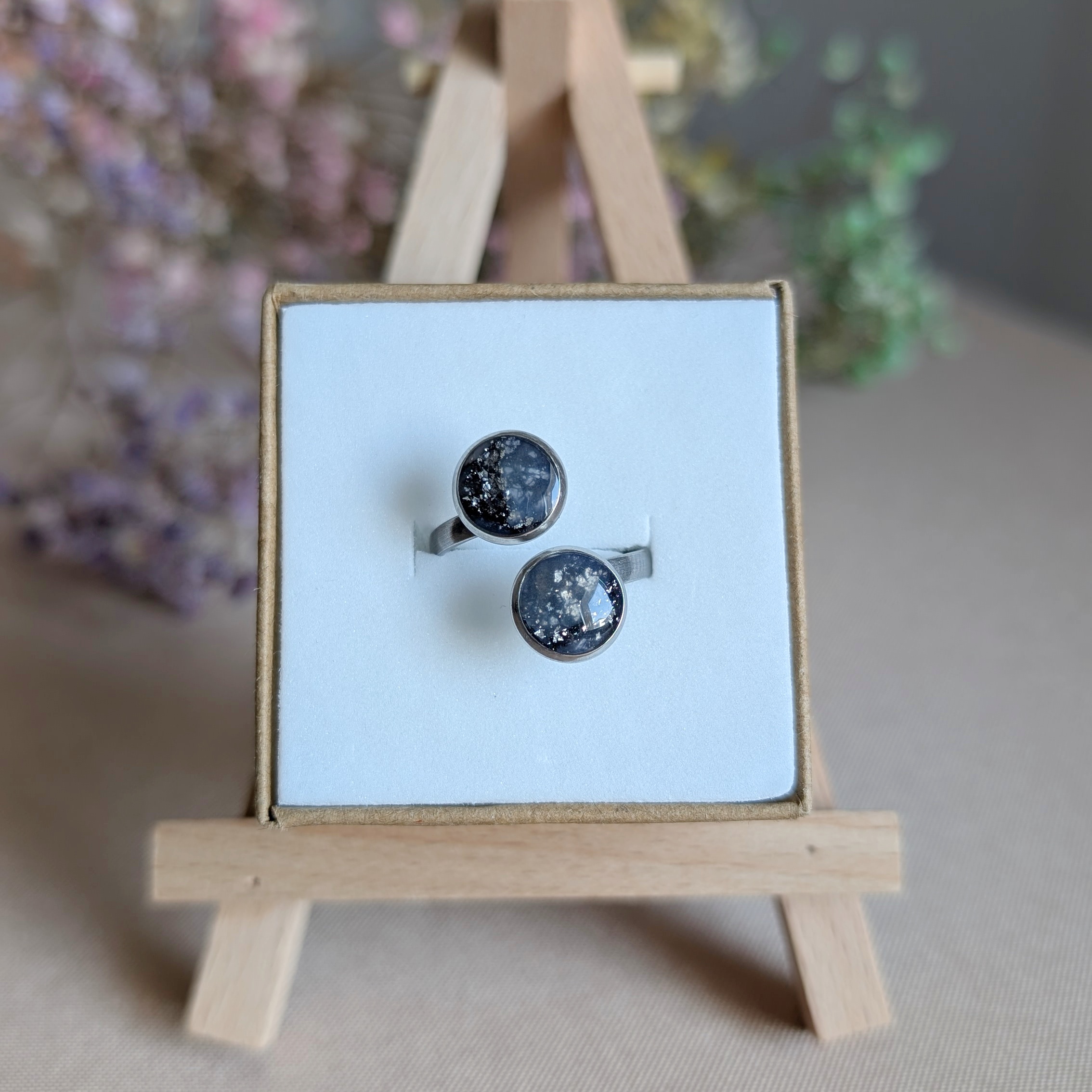 Elegancja w minimalistycznym wydaniu. Ten wyjątkowy, ręcznie wykonany pierścionek zachwyca kontrastem głębokiej czerni i delikatnych refleksów srebrnej folii. Mieni się subtelnie w świetle, tworząc efekt przypominający rozgwieżdżone niebo lub taflę obsydianu.
