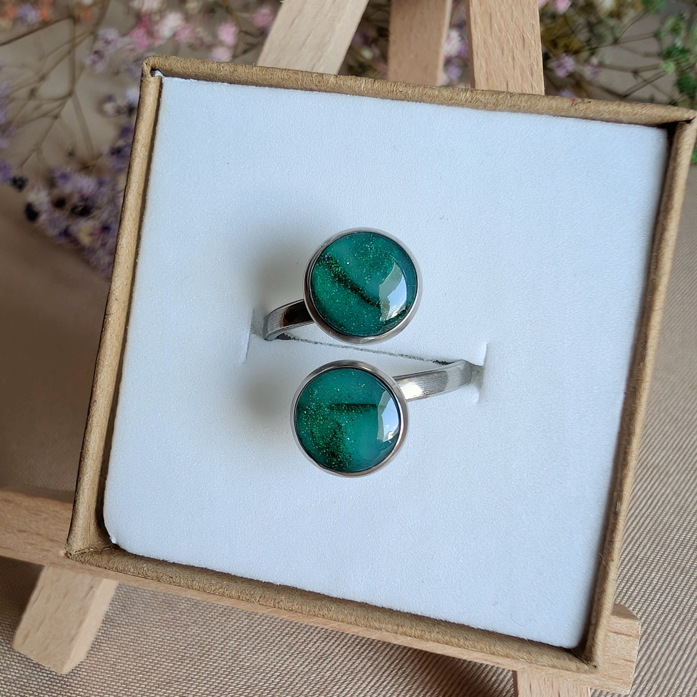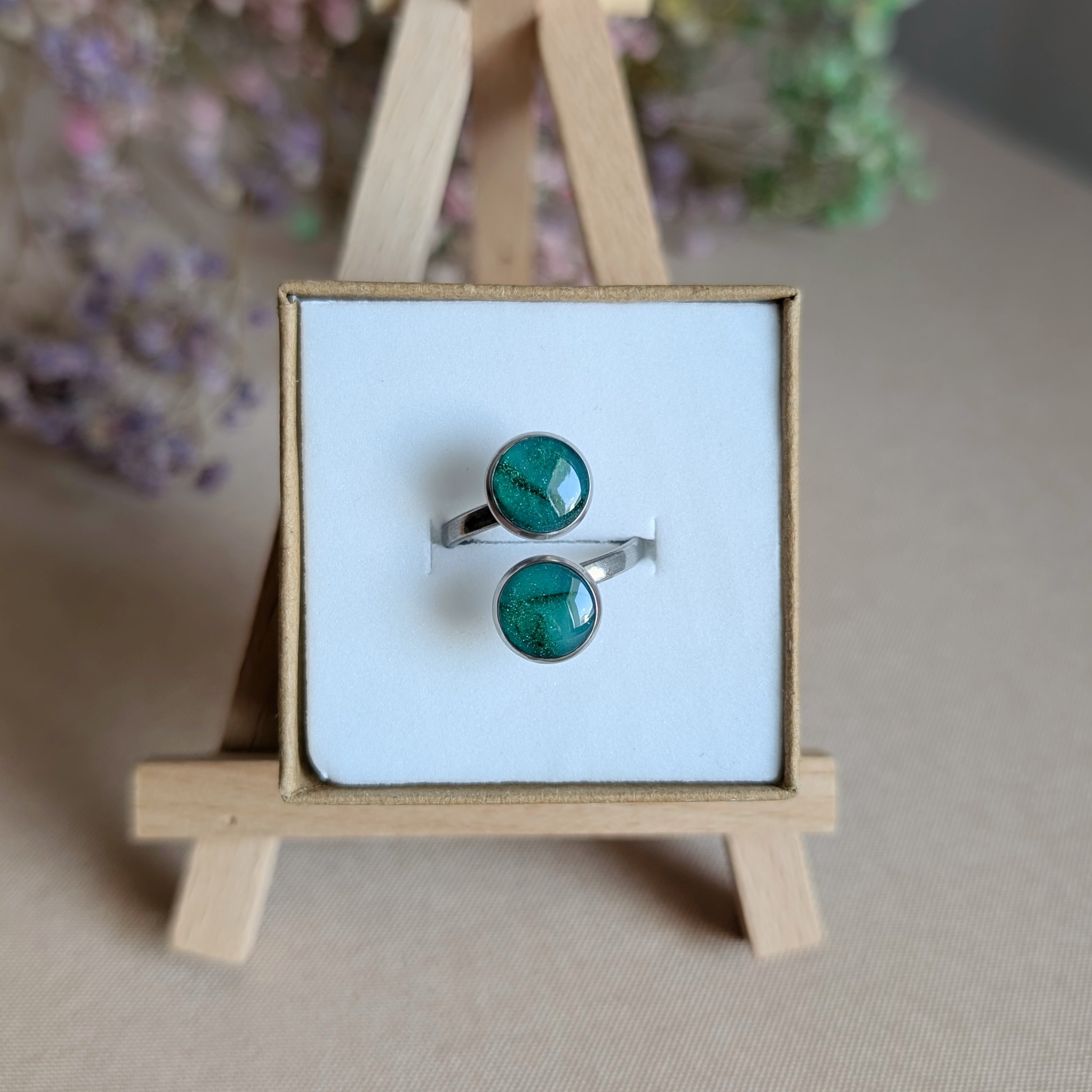 Subtelny i pełen harmonii pierścionek z dwoma zielonymi oczkami – jak krople rosy wśród lasu. Ręcznie wykonany, z miłością do detali i natury. Oczka lśnią w świetle, przywodząc na myśl spokój lasu i energię przyrody.