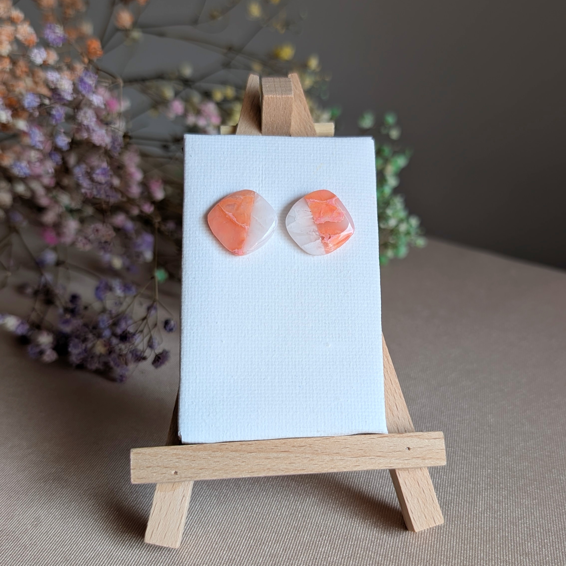 Subtelne, lekkie i z artystycznym charakterem – te kolczyki z gliny polimerowej to połączenie prostoty i elegancji. Ich wyjątkowy, lekko zaokrąglony kształt o nieregularnych liniach nadaje im naturalny, organiczny wygląd, a delikatne połączenie bieli z transparentnym pomarańczem tworzy efekt przypominający mleczne szkło lub kamień.