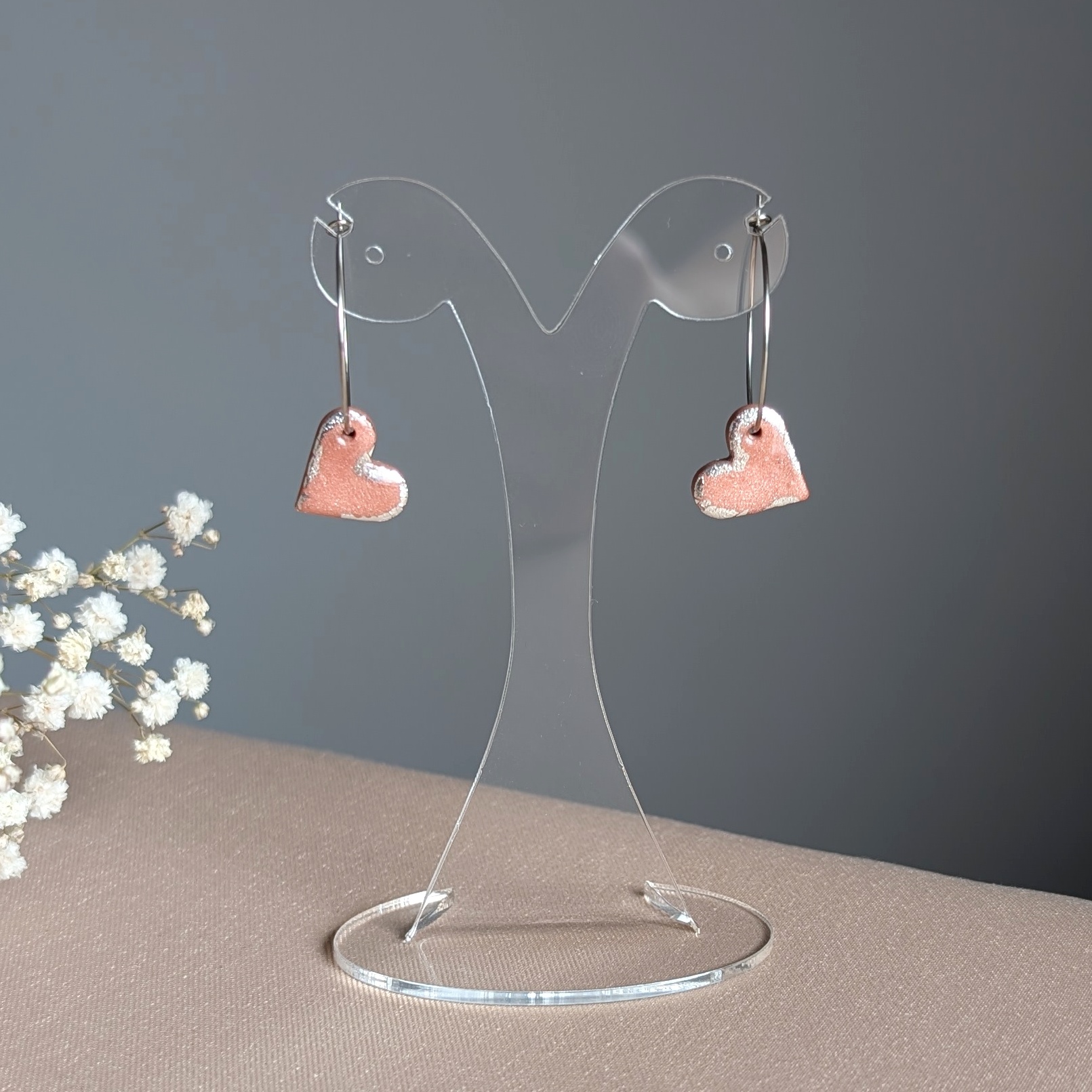 Te kolczyki to świetne połączenie elegancji i delikatności – subtelne serduszka w odcieniu różowego, przybrudzonego złota z tysiącami skrzących się drobin tworzą efekt biżuterii lekkiej, ale bardzo efektownej.