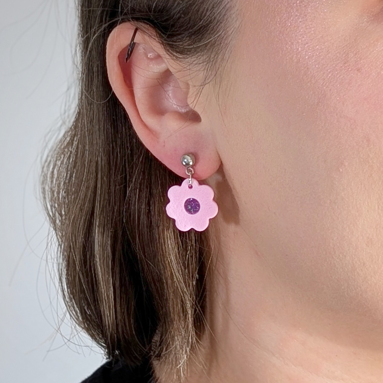 Kolczyki „Różowe Kwiatuszki z Brokatowym Środkiem” – delikatność z nutką błysku!