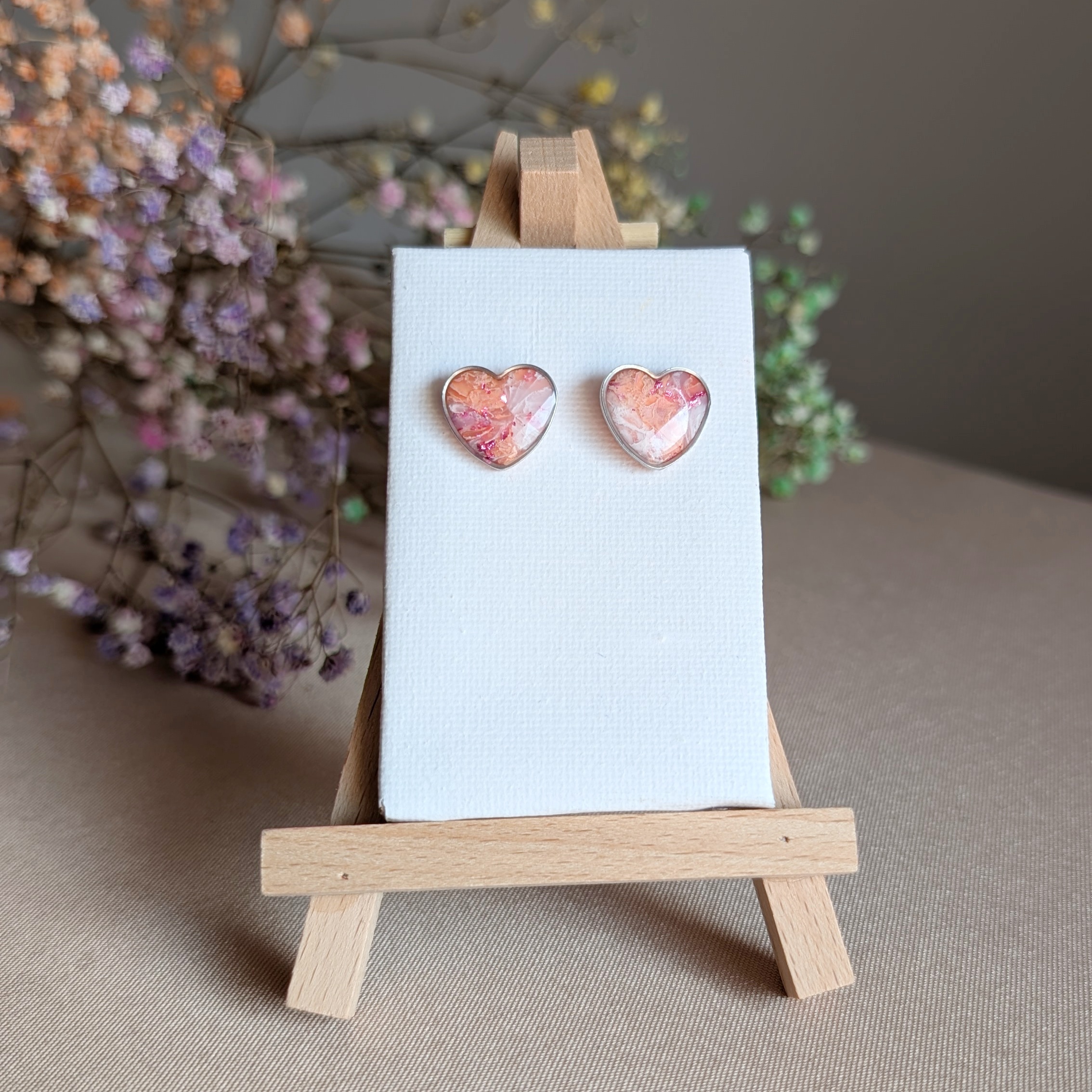 Delikatna, kobieca i pełna ciepła – te ręcznie wykonane kolczyki w kształcie serca zachwycają swoją subtelnością i unikalnym wzorem. Wnętrze serduszka skrywa kompozycję różowo-koralowych odcieni, które przywodzą na myśl zachód słońca, kwitnące kwiaty i słodkie wspomnienia.