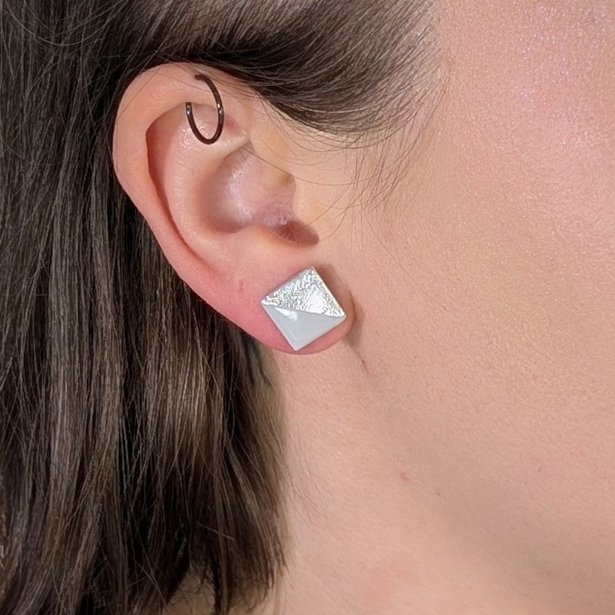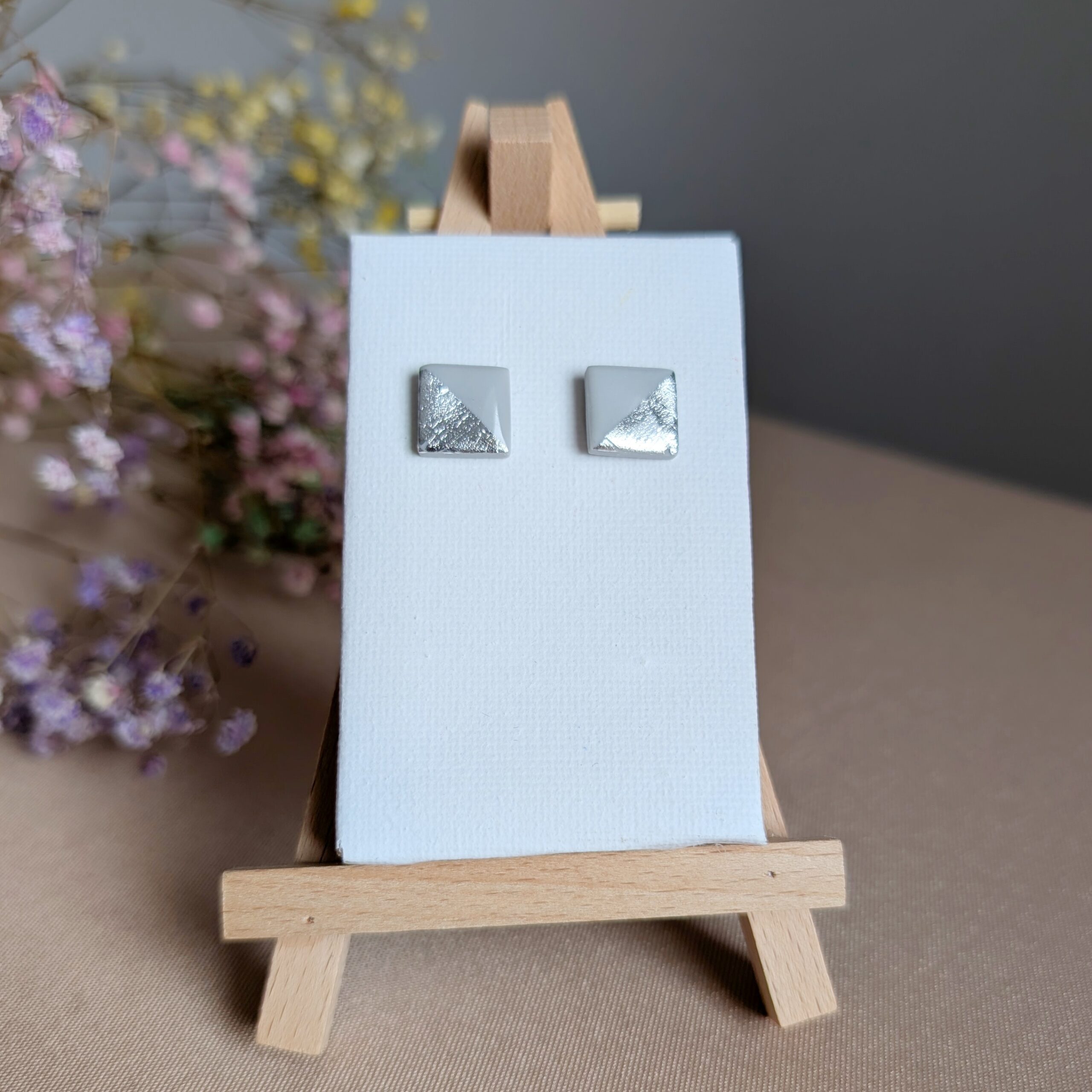 Minimalizm spotyka się z elegancją. Szare kolczyki w kształcie kwadratu wykonane z gliny polimerowej to nowoczesny dodatek, który zachwyca prostą formą i luksusowym wykończeniem. Połowa powierzchni zdobiona jest srebrną folią, która pięknie kontrastuje z szarością, tworząc biżuterię idealną na każdą okazję.