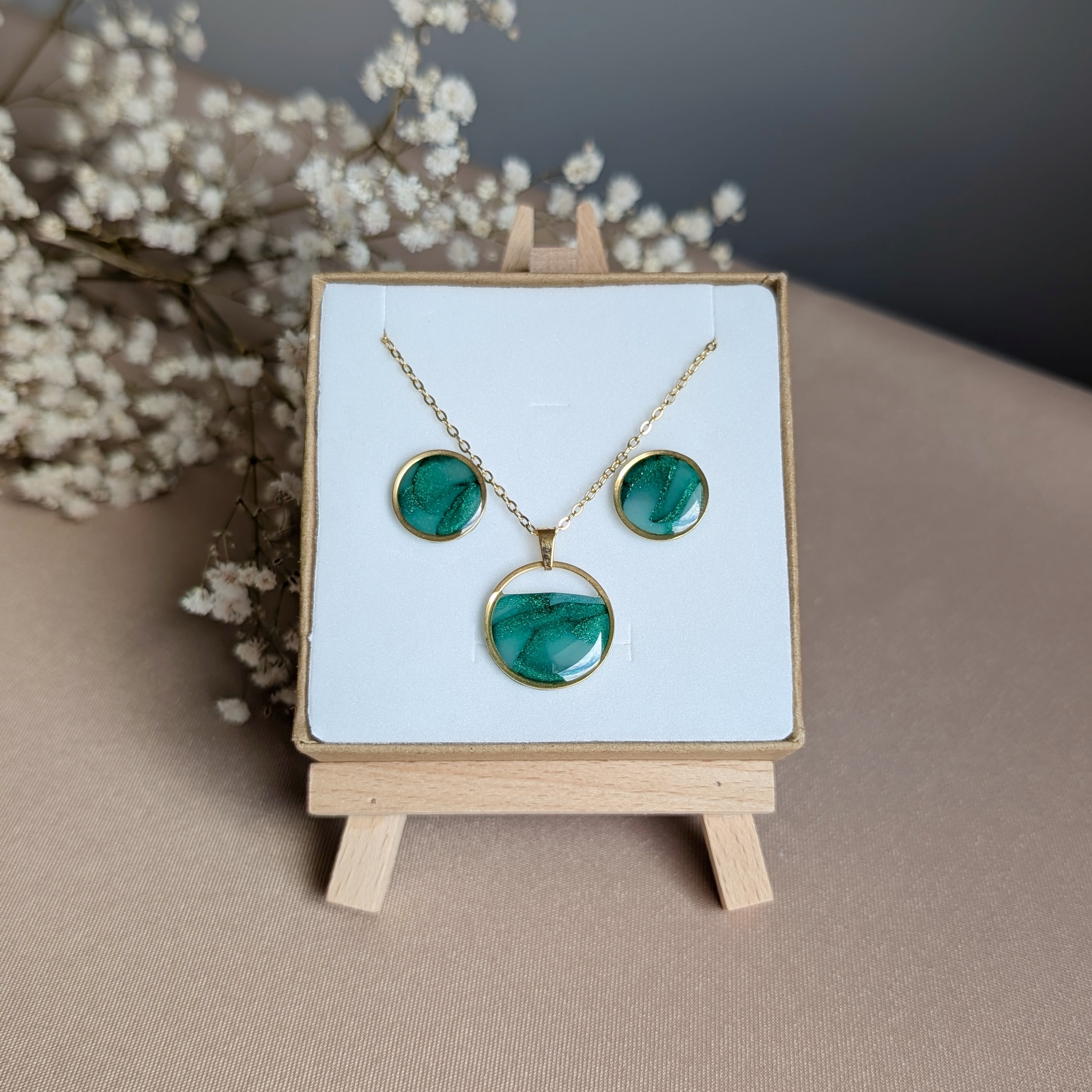 Podkreśl swój styl wyjątkowym zestawem biżuterii handmade wykonanym z wysokiej jakości gliny polimerowej. Ten elegancki komplet składa się z pary kolczyków oraz naszyjnika z zawieszką, utrzymanych w modnych odcieniach zieleni i złota.