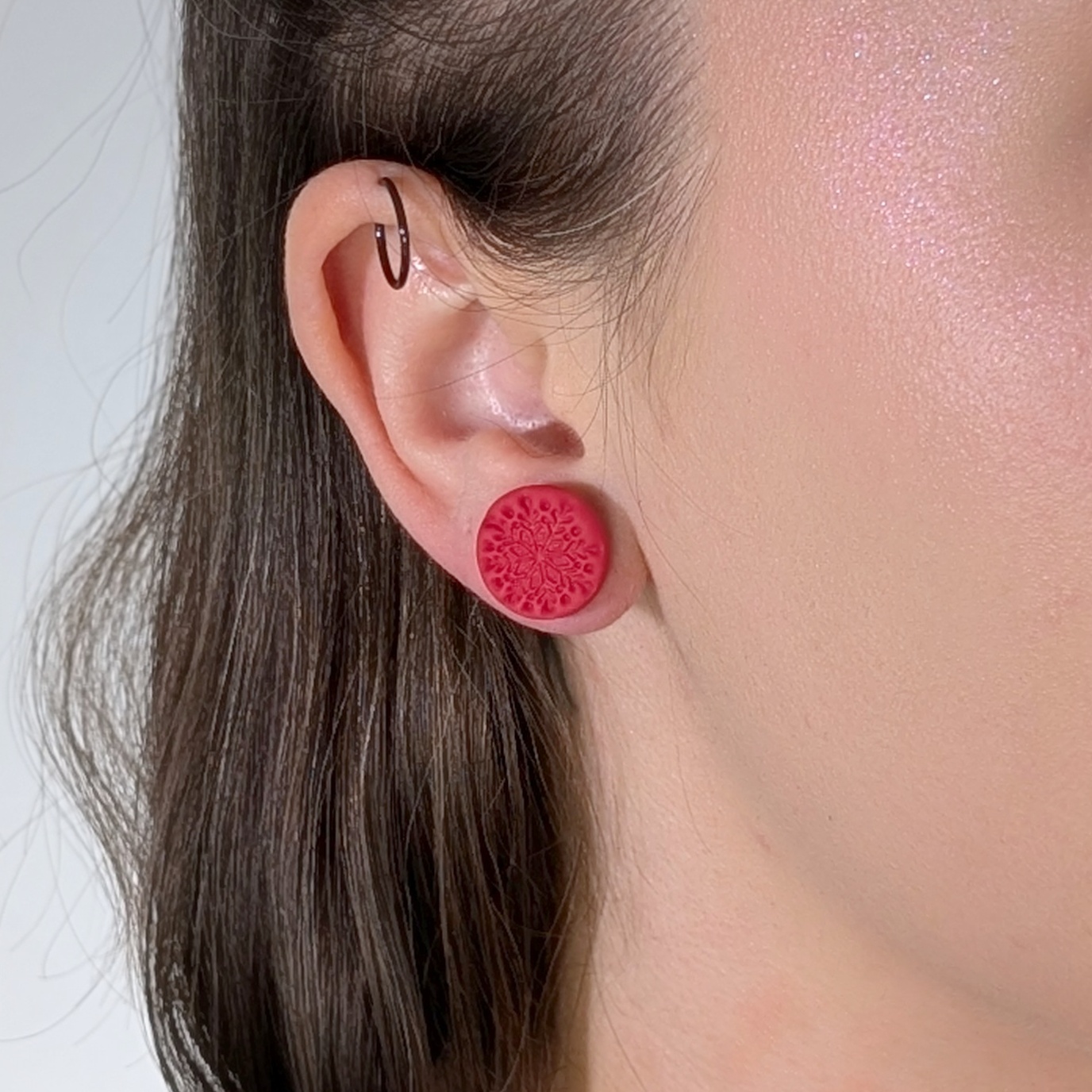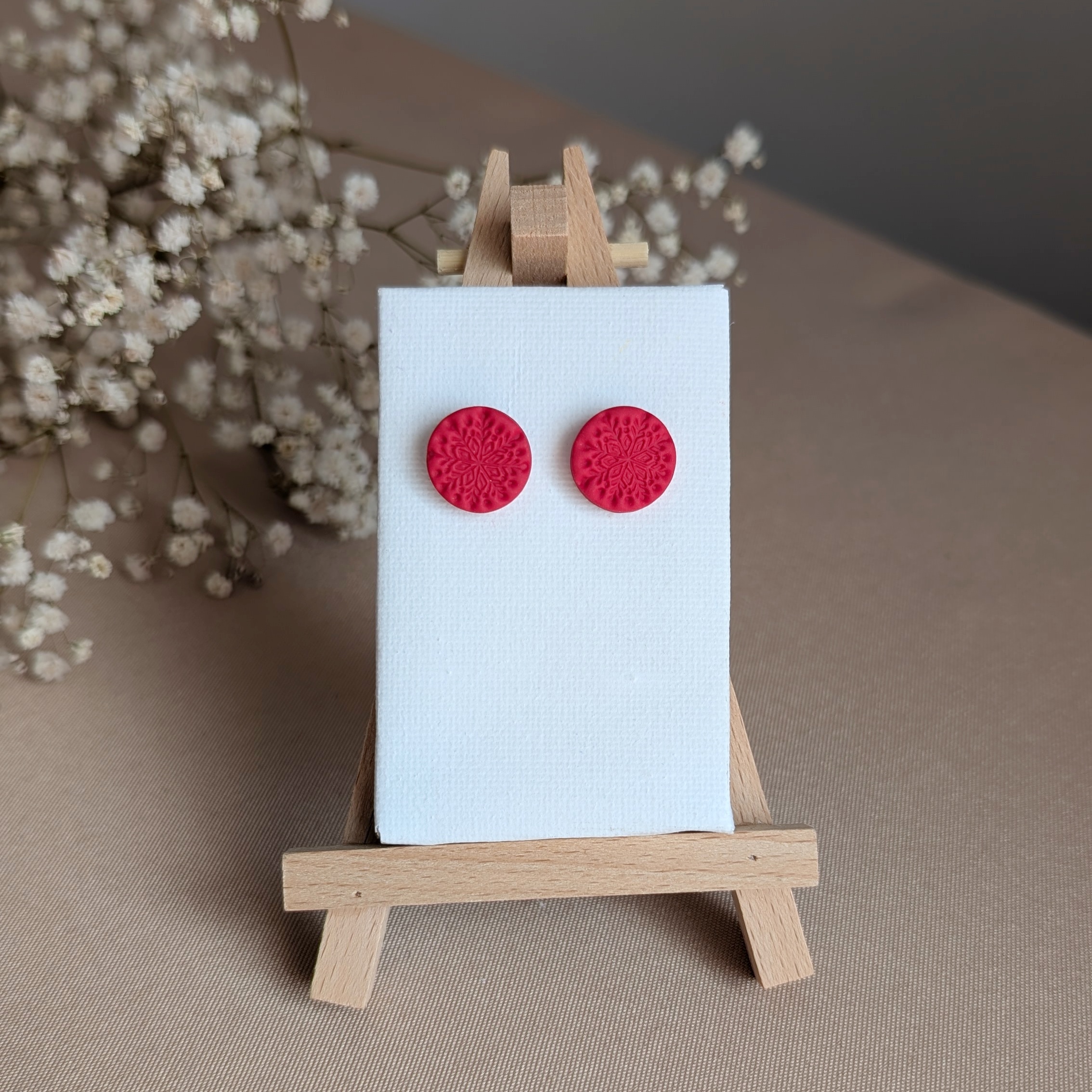 Ręcznie robione kolczyki świąteczne w kolorze winnej czerwieni z finezyjnie tłoczonym, ażurowym motywem inspirowanym naturą i zimowymi ornamentami