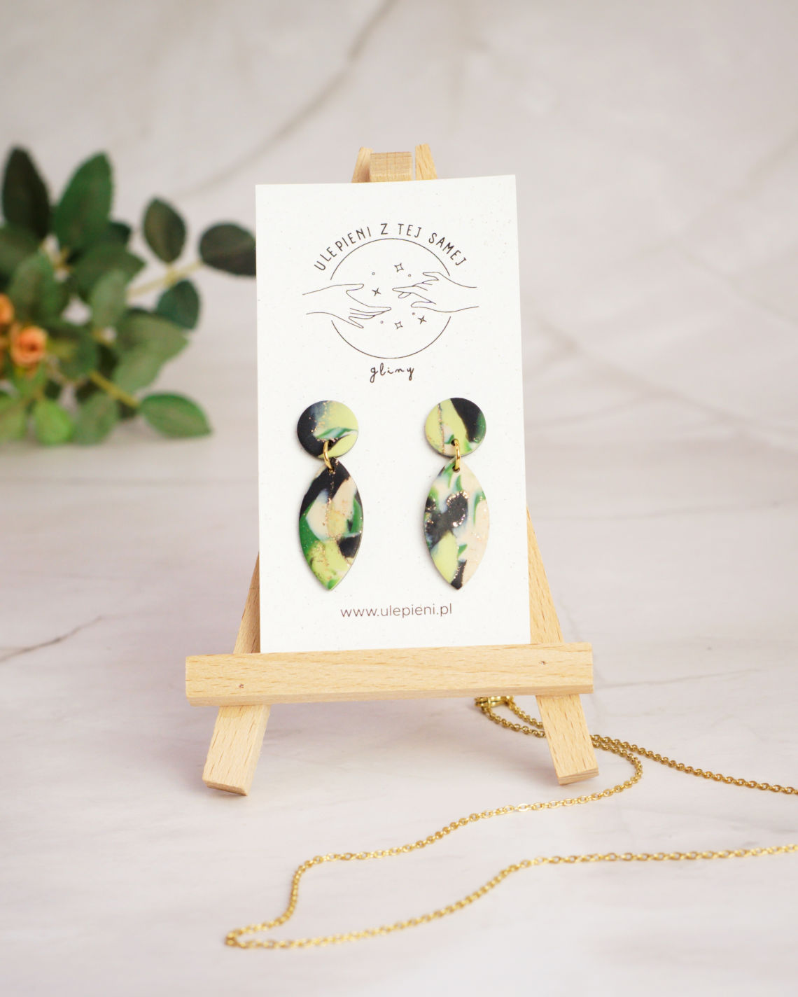 Wyraziste, a jednocześnie eleganckie. Te ręcznie robione kolczyki z gliny polimerowej zachwycają niepowtarzalnym wzorem w odcieniach zieleni, czerni i kremu, przełamanym subtelnym złotym detalem. Ich organiczny, lekko wydłużony kształt pięknie wysmukla szyję i dodaje stylizacji charakteru. Połączenie geometrycznej górnej części z podłużną, liściową formą tworzy nowoczesny, a zarazem naturalny efekt. To idealny dodatek dla kobiet, które lubią biżuterię artystyczną, ale w eleganckim wydaniu.