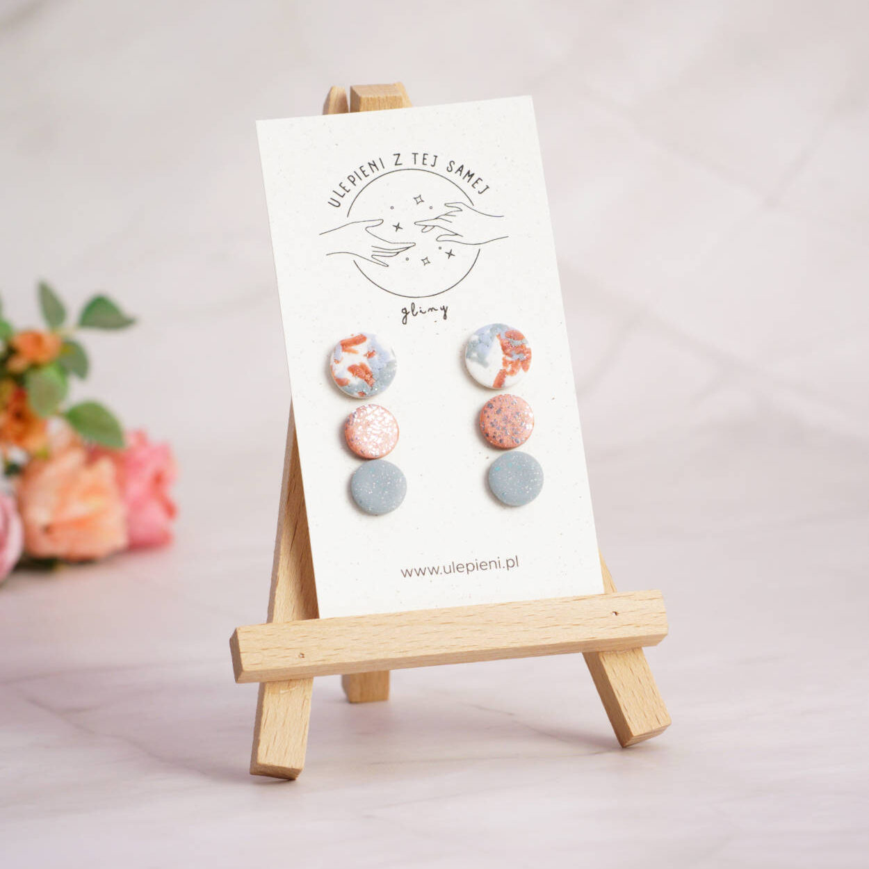 Oryginalny zestaw kolczyków handmade, który pozwala tworzyć różne stylizacje w zależności od nastroju. Kompozycja trzech par w harmonijnych odcieniach gołębiej szarości, bieli, błękitu i miedzianego różu inspirowana jest naturą, kamieniem i strukturą lastryko.